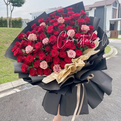 Details: 89 Stalks Fresh Kenya Red Roses + 10 Stalks Fresh Cappuccino Roses + Black Wrapping