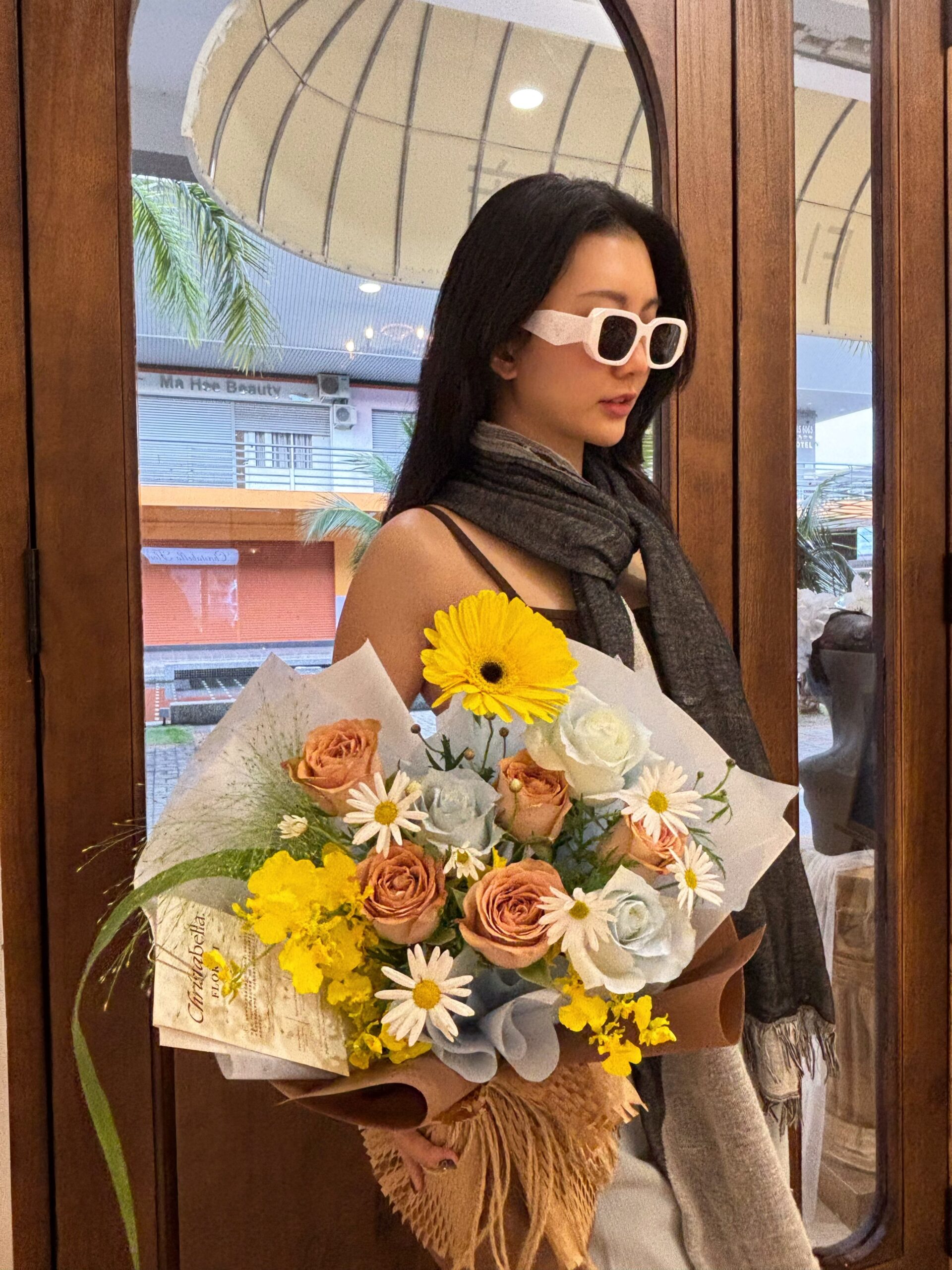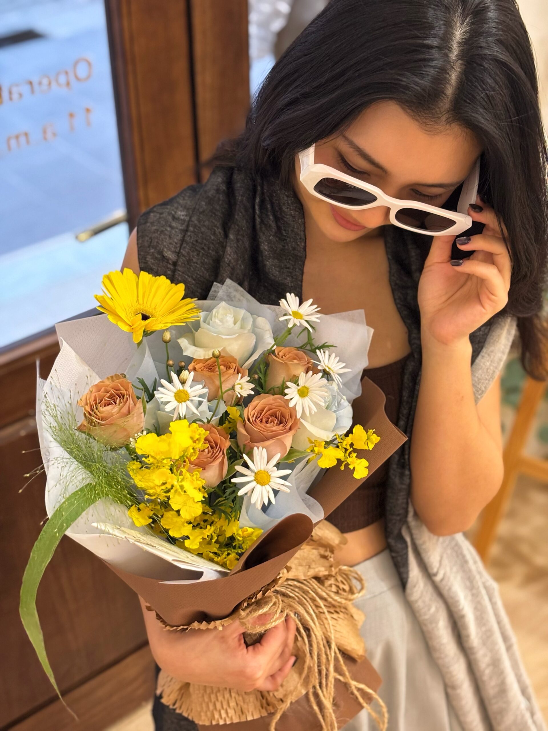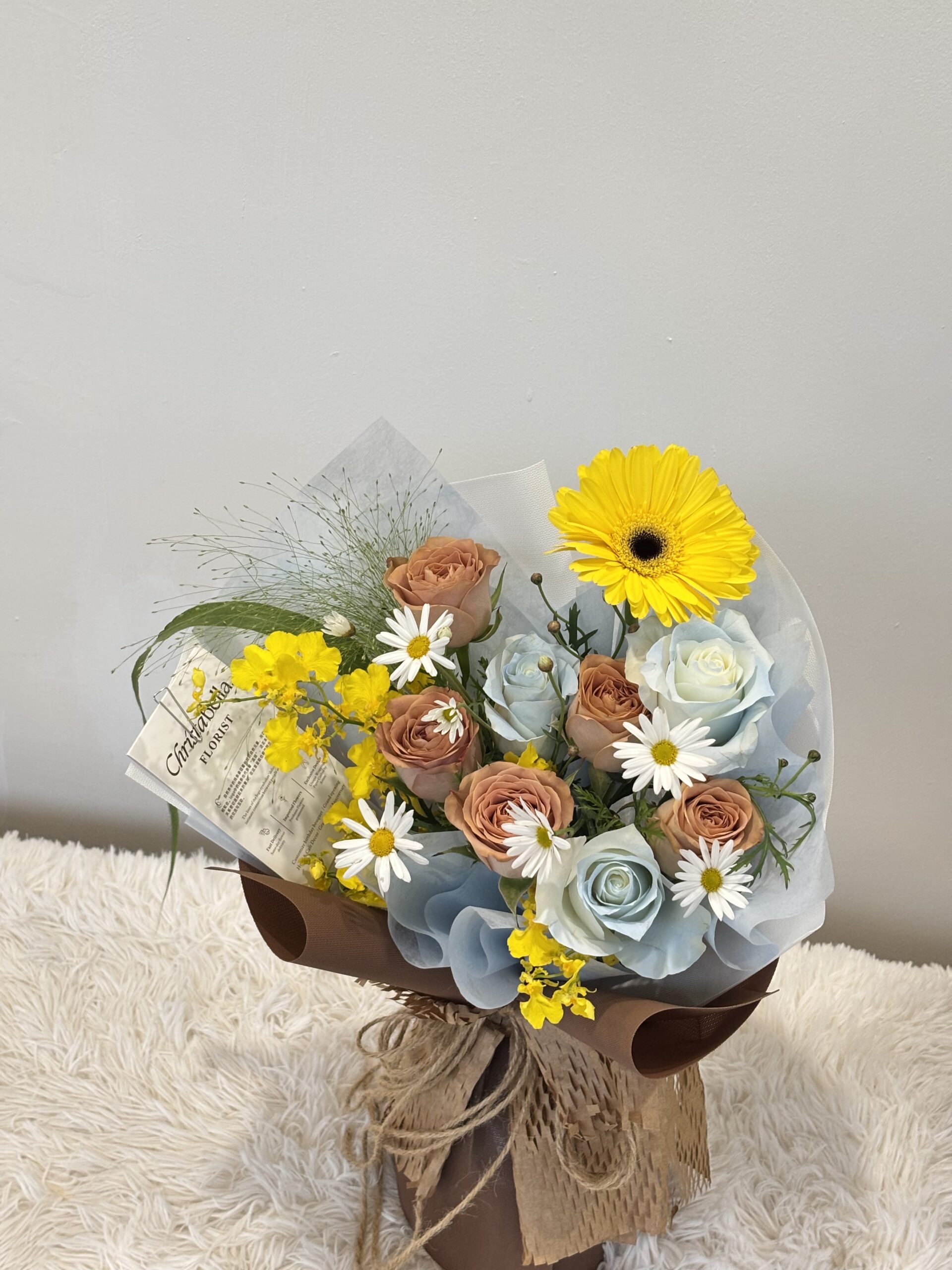 Details: Mix Fresh Flower-7stl Roses + 1stk Gerbera + Dancing Lady + Hana White + Pancium + white&brown wrapping (M size)