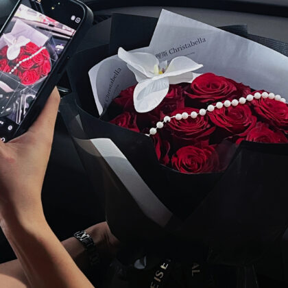 Details: 10 Stalks Fresh Red Roses + Phalaenopsis + Pearl Chain + Black Wrapping