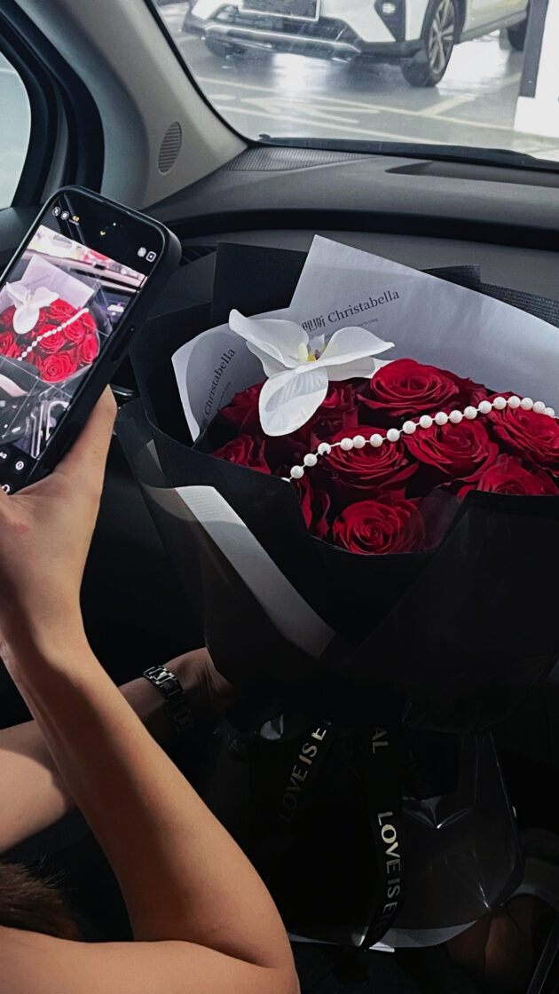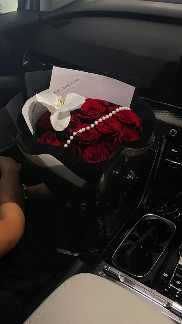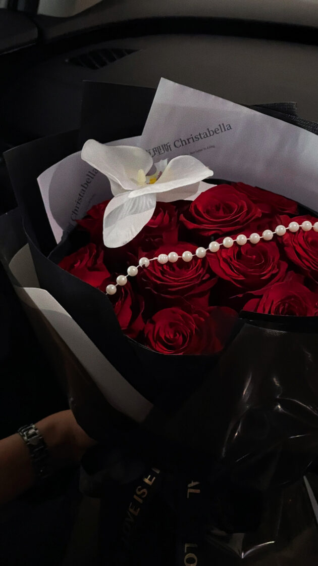 Details: 10 Stalks Fresh Red Roses + Phalaenopsis + Pearl Chain + Black Wrapping