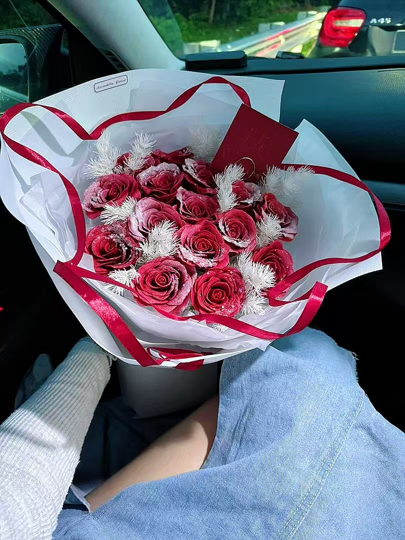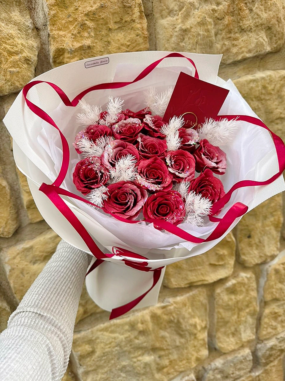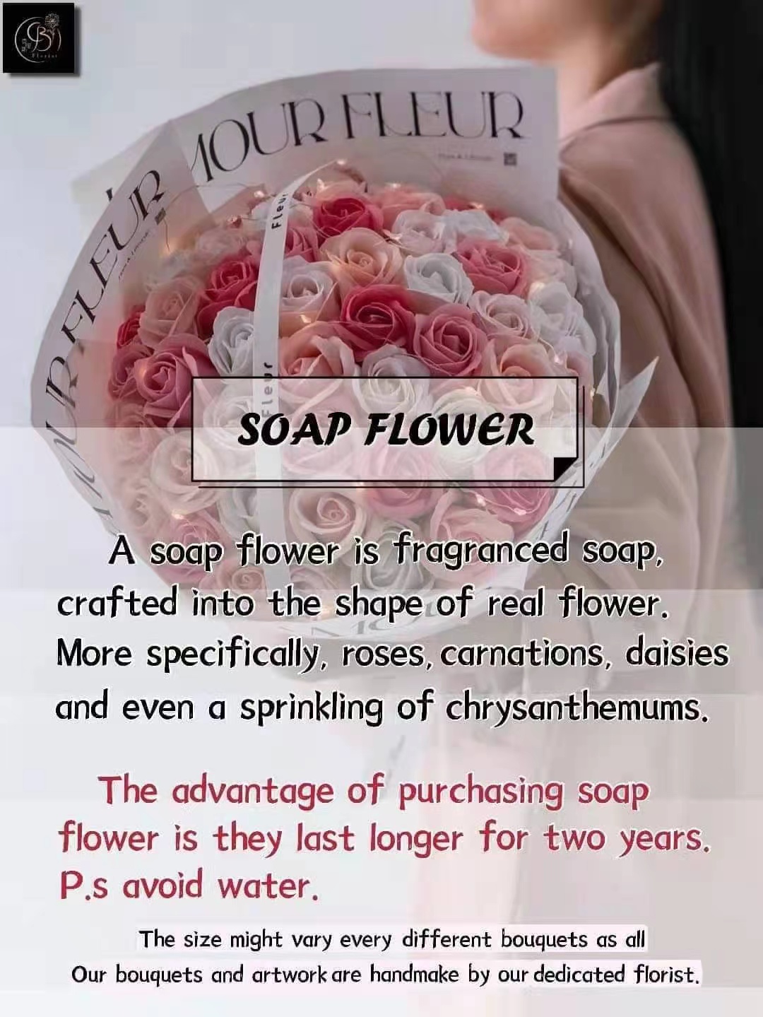 Details: 16 Stalks Soap Red Roses + 4*Asparagu + White WrappingSize: M SizePreorder: 2-3 Days
