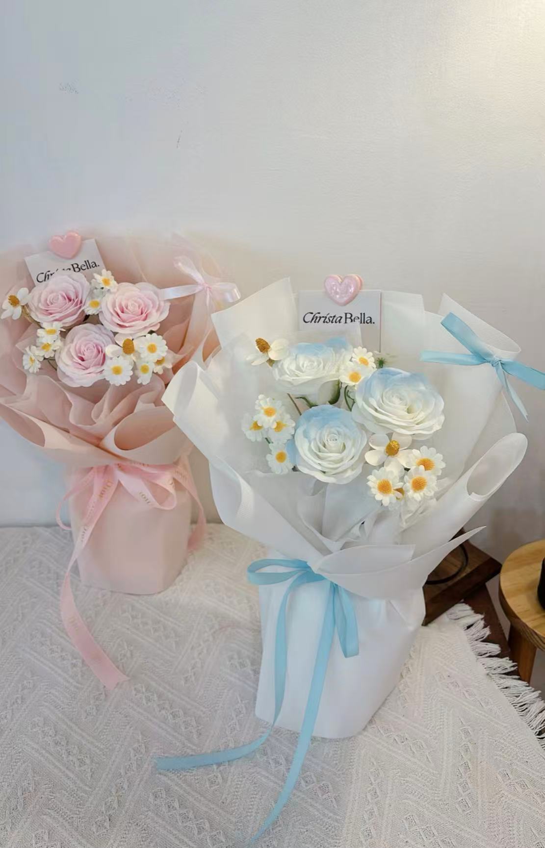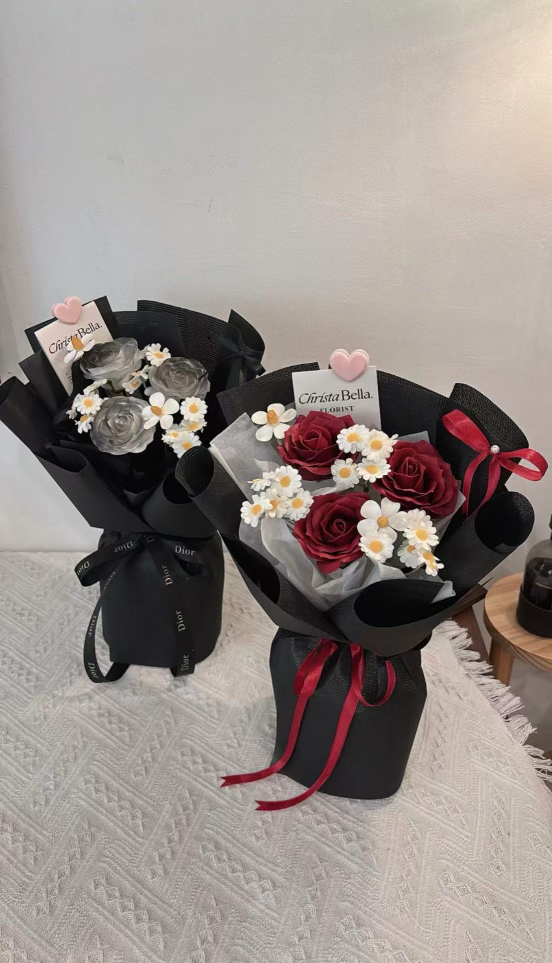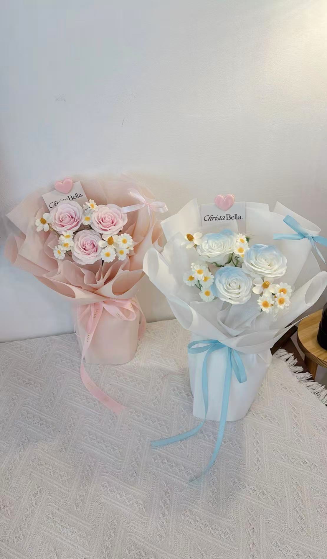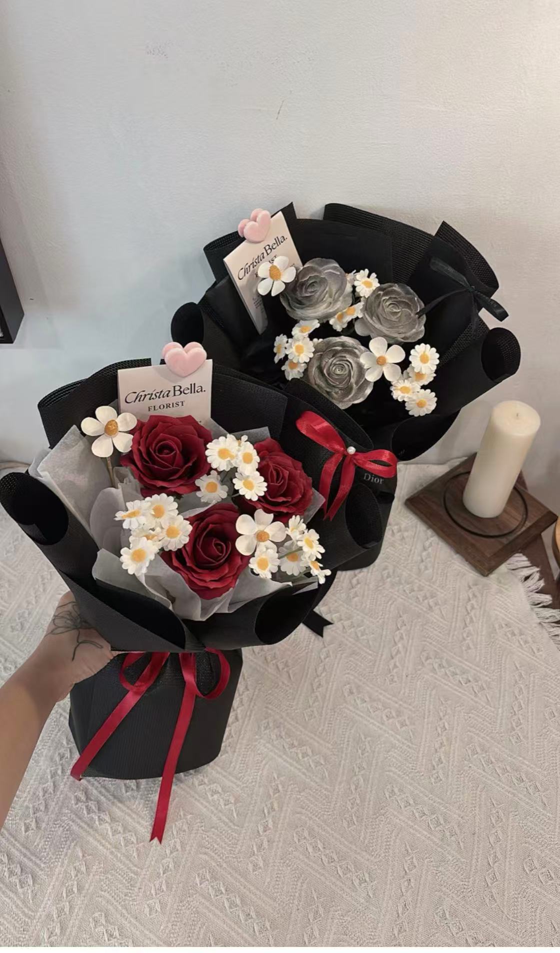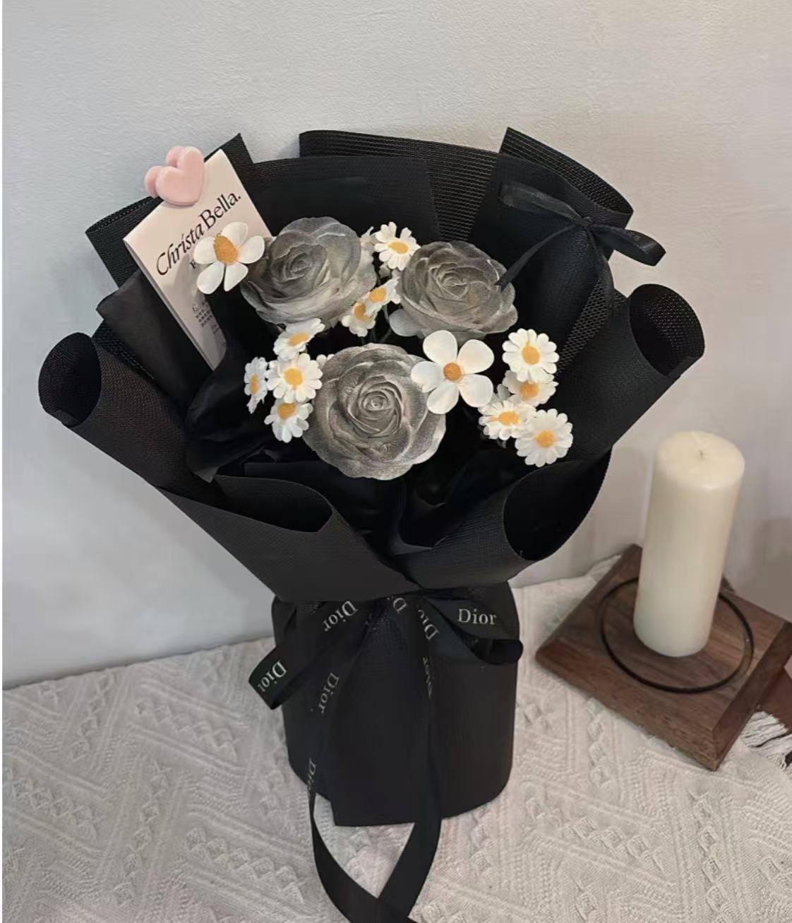 Details: 3 Stalks Roses+1 Stalk Chamomile+2 Stalks Small Flower(Black/White/Pink Wrapping)S size-(Fresh RM130/ Soap RM100)