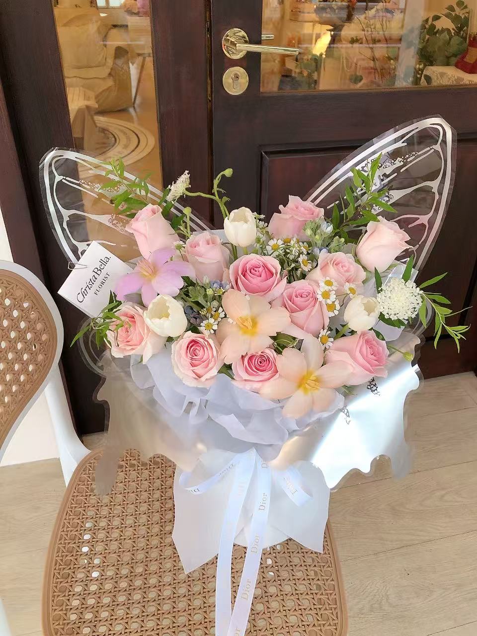 Butterfly Fresh Mix Pink Roses & Tulip Flower Bouquet(AUG)