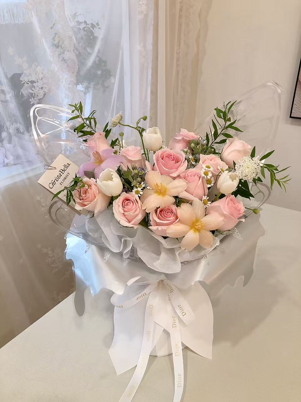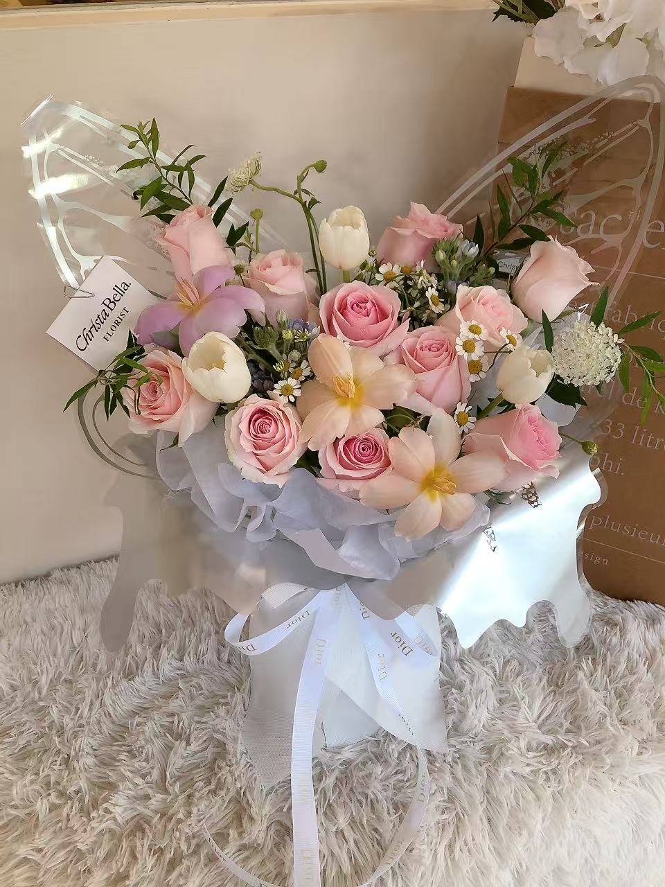 Details: 10 Stalks Pink Roses + 6 Stalks Tulip + 2 Stalks Oxypetalum + 2 Stalks Chamomile + Leaf + Trachymene + (White Wrapping)M Size-RM330