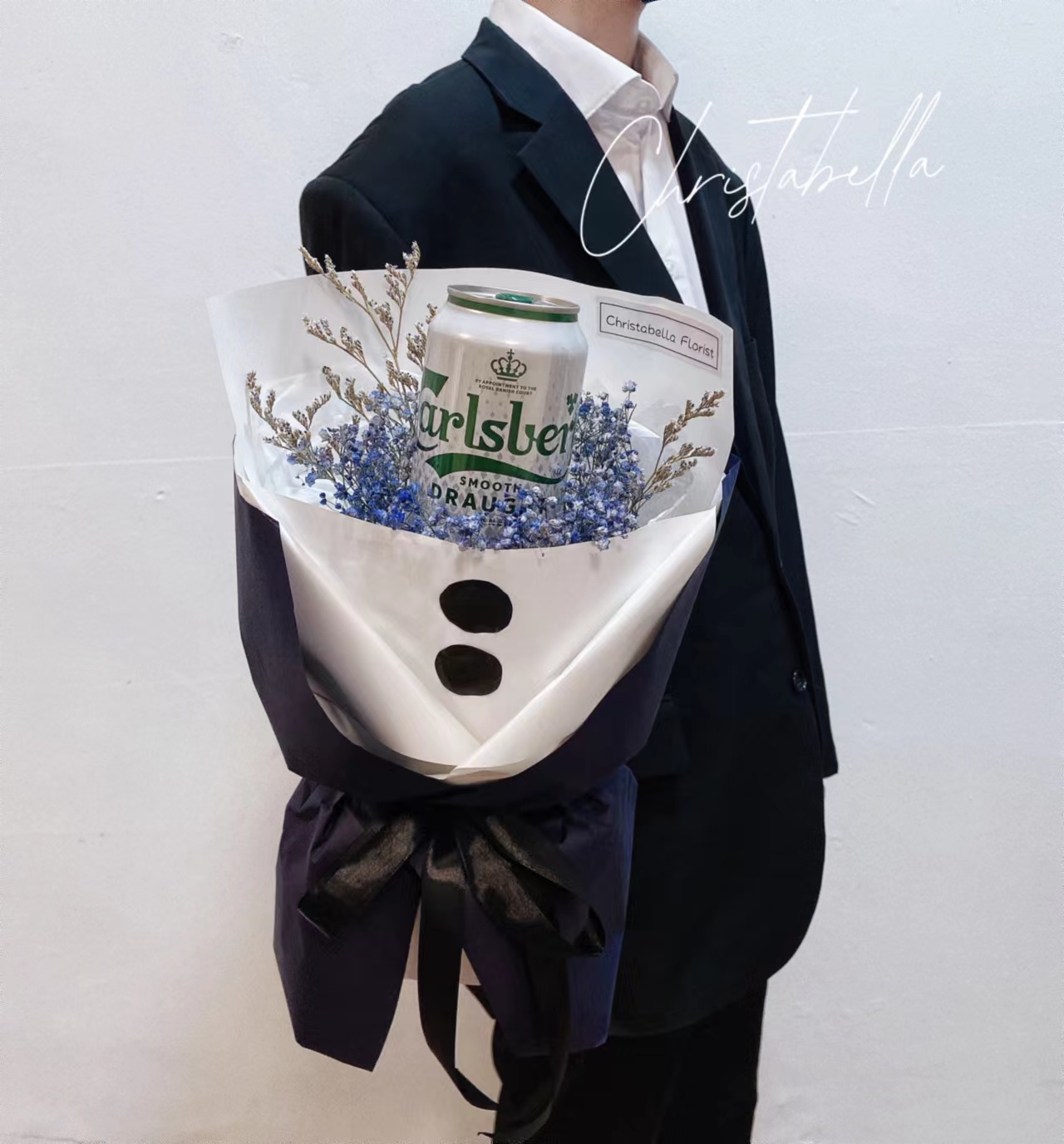 Details: 1 Can Carlsberg + 2 Stalks Freah Baby Breath + Nay Wrapping