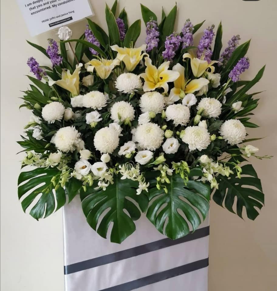 * Lily,net num,matthiola,dendrobium,ecutoma, accompanied with matching greens. * Approx. height:175cm x width:70cm * Actual colour tones of flowers may differ slightly from image.