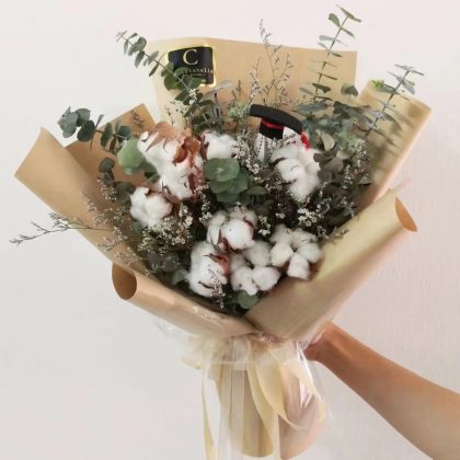 Details:10 Stalks Dry Cotton + 1 Graduation Hat + Eucalyptus + Light Kraft Wrapping