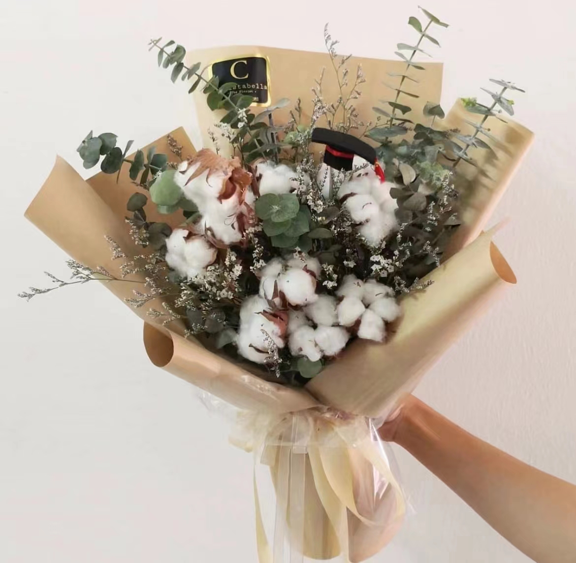 Details:10 Stalks Dry Cotton + 1 Graduation Hat + Eucalyptus + Light Kraft Wrapping