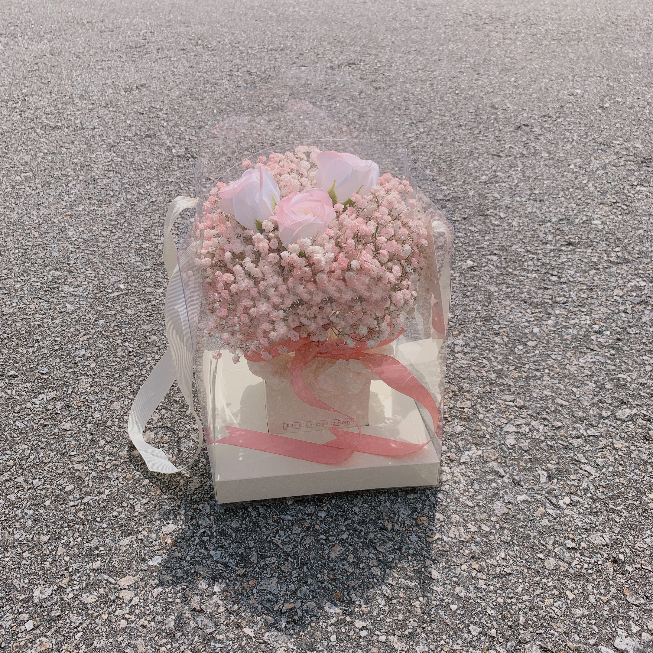 Details: M Size Fresh Baby Breath + 3 Stalks Soap Ombre Pink Roses + Box