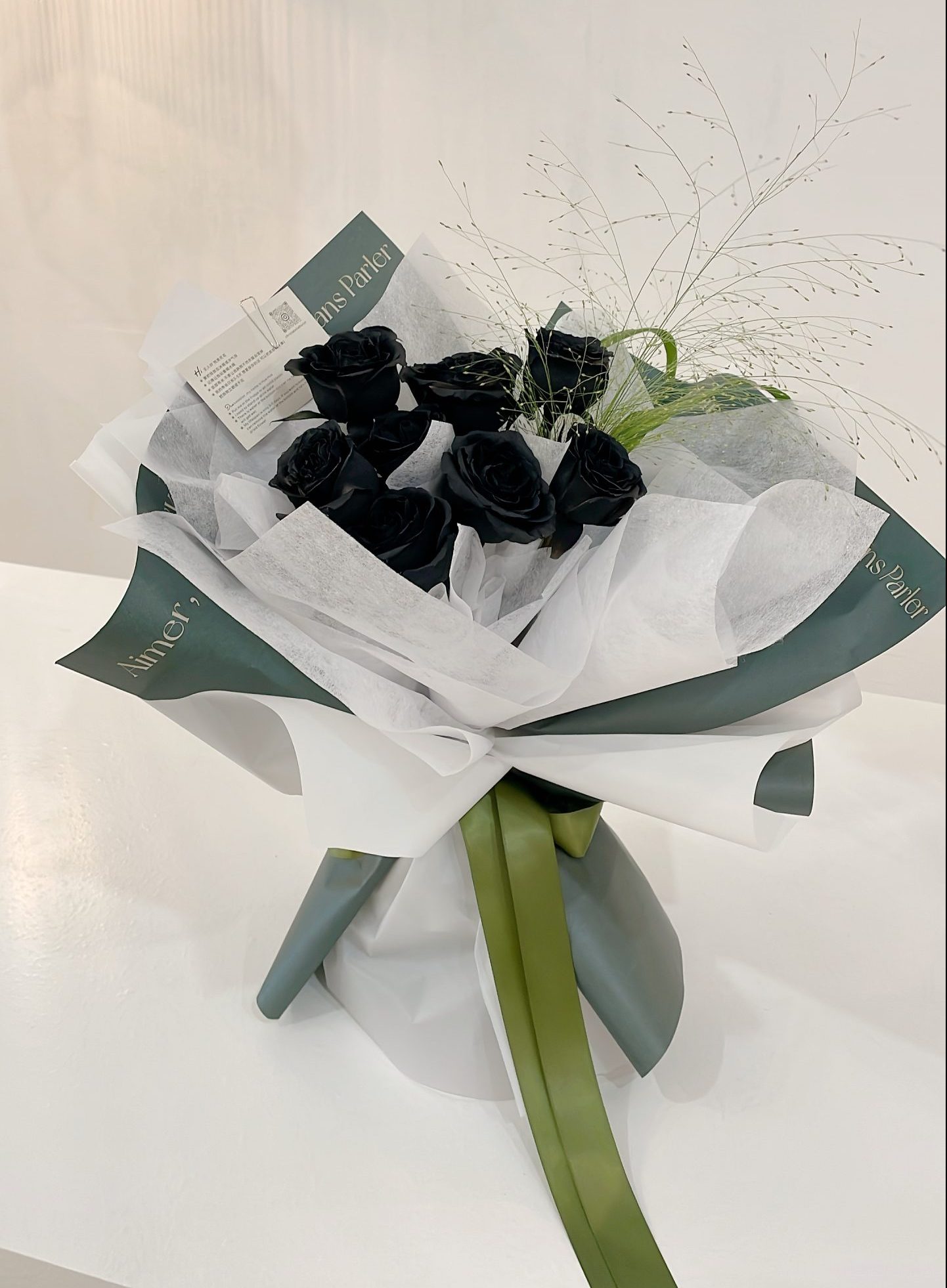 Details: 8 Stalks Fresh Kenya Black Roses + 1 Stalks Pancium + Green & White Wrapping