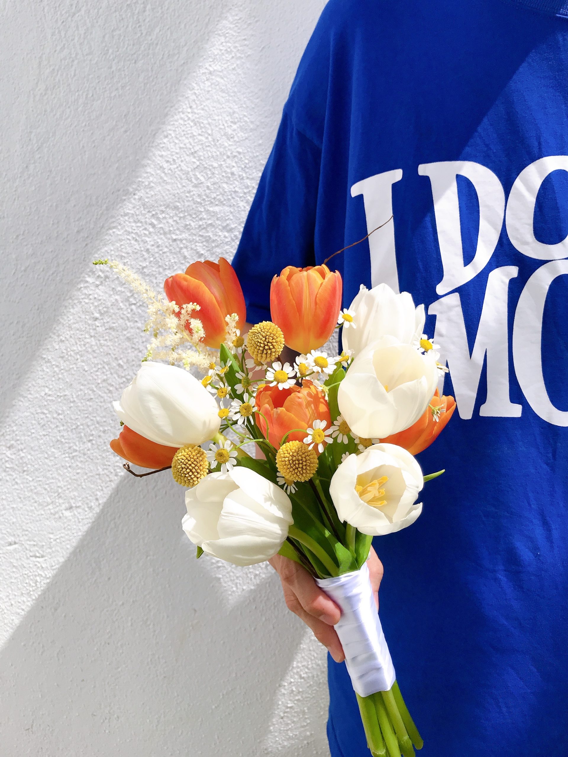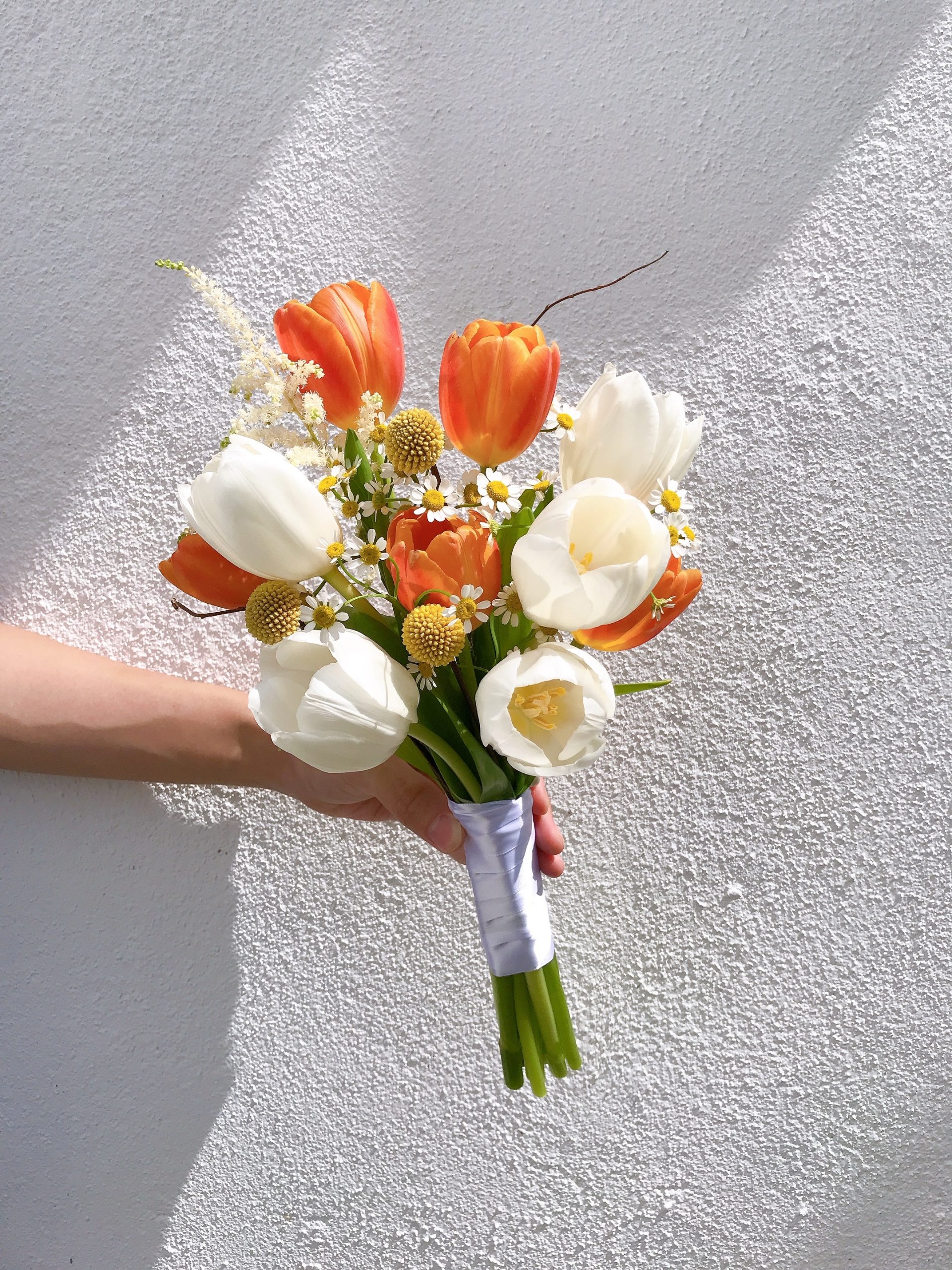 Details: 5 Stalks Fresh Orange Tulips + 5 Stalks Fresh White Tulips + 1 Stalks Astilbe + 2 Stalks Chamomile