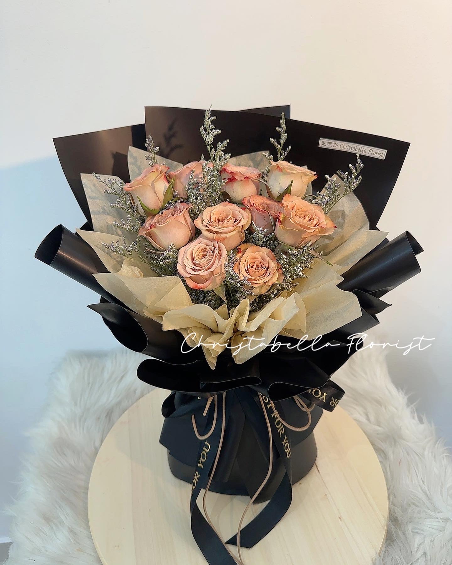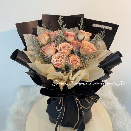 Details: 10 Stalks Fresh Cappuccino Roses + Black Wrapping