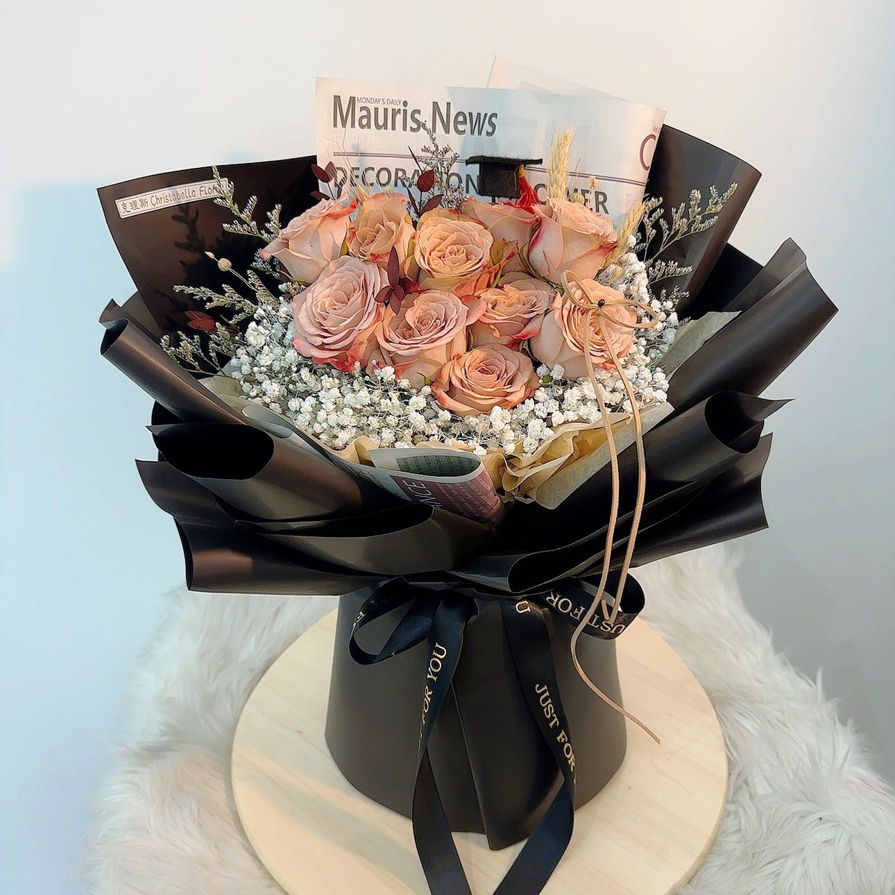 - 10 Stalks Fresh Cappuccino + 2 Stalks Baby Breath + Graduation Hat + Black Wrapping (M Size)