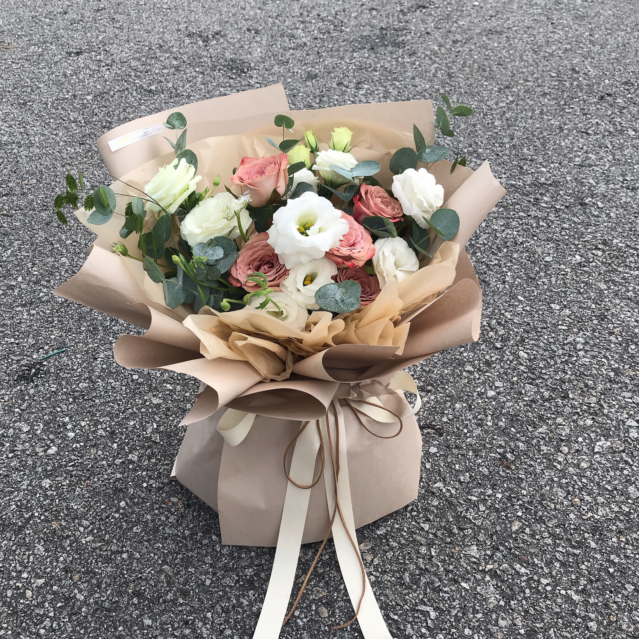 Details: 5 Stalks Fresh Cappuccino Roses + 4 Stalks Eustoma + 1 Stalks Trachymene + Eucalyptus Leave + Khaki Wrapping