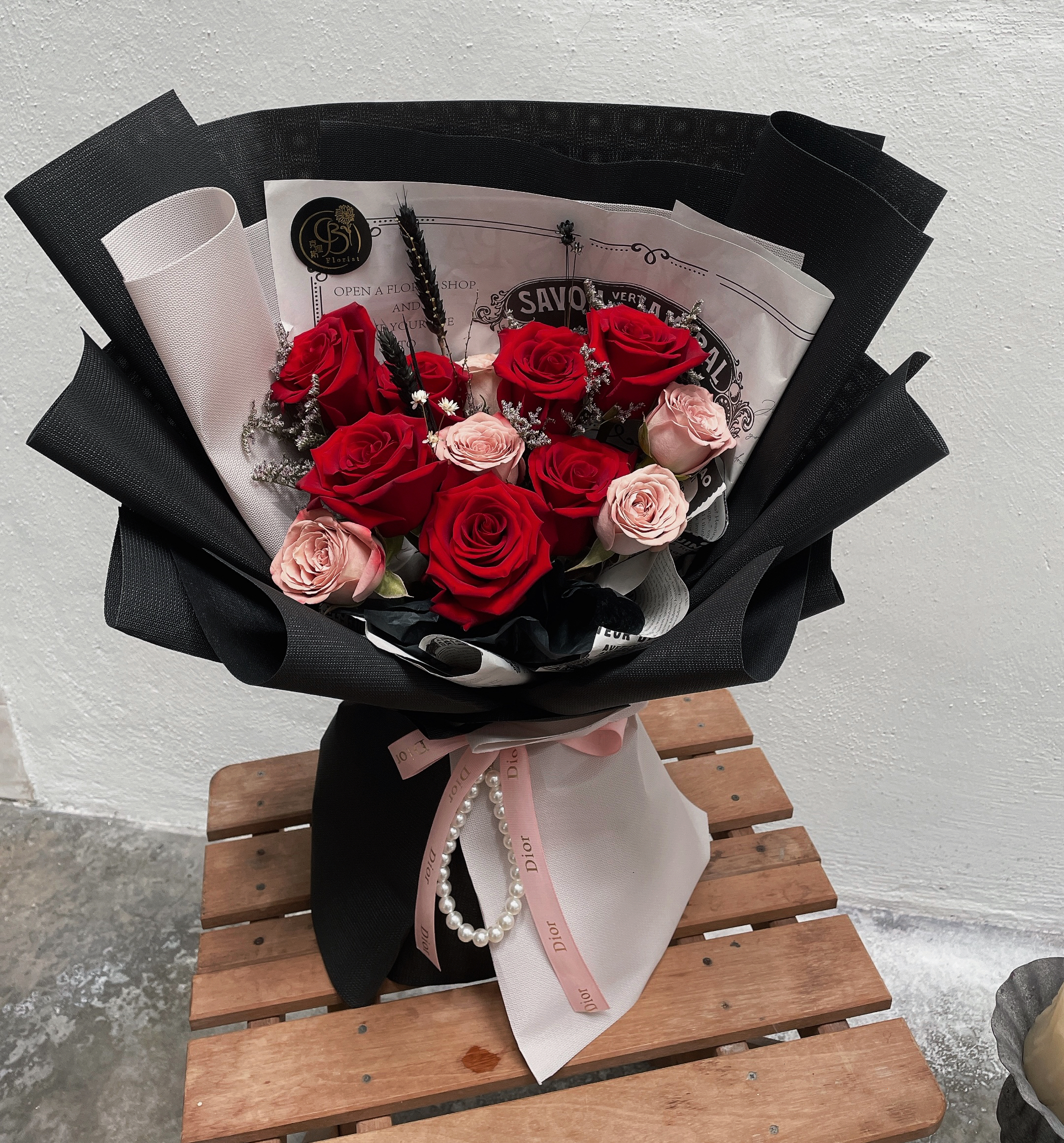 Details: 7 Stalks Fresh Kenya Red Roses + 5 Stalks Fresh Cappuccino Roses + Caspia + Pearl Chain + Black Wrapping