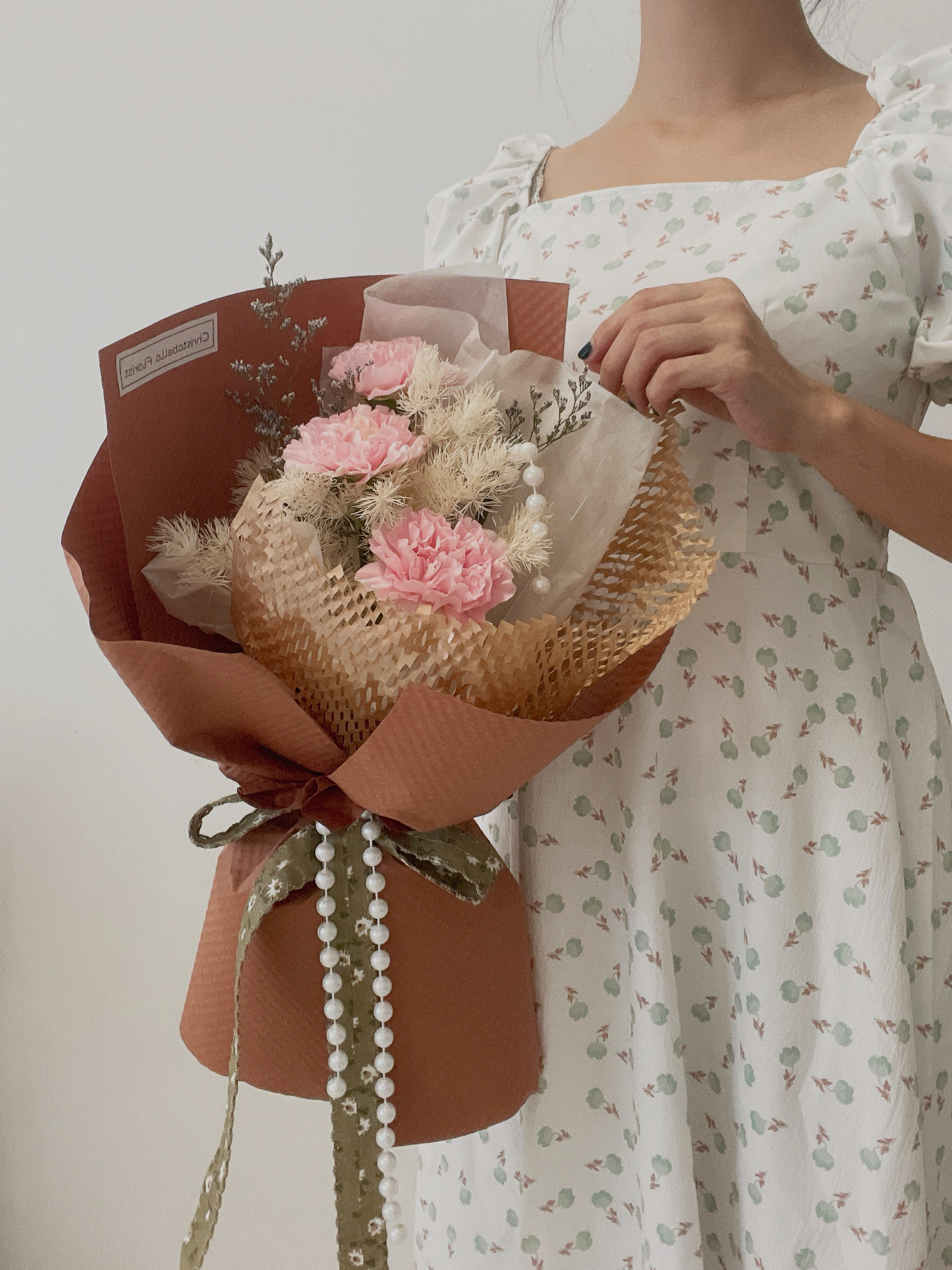 Details: 3 Stalks Fresh Carnation + Pearl Chain + Caspia + Brown Wrapping