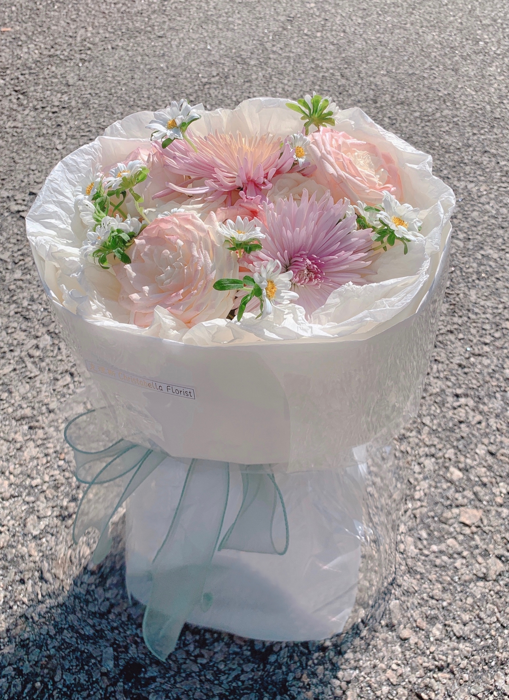 Details: 5 Stalks Fresh Kenya Ombre Pink Roses + 2 Stalks Hana White + 2 Stalks Net Mum + White Wrapping