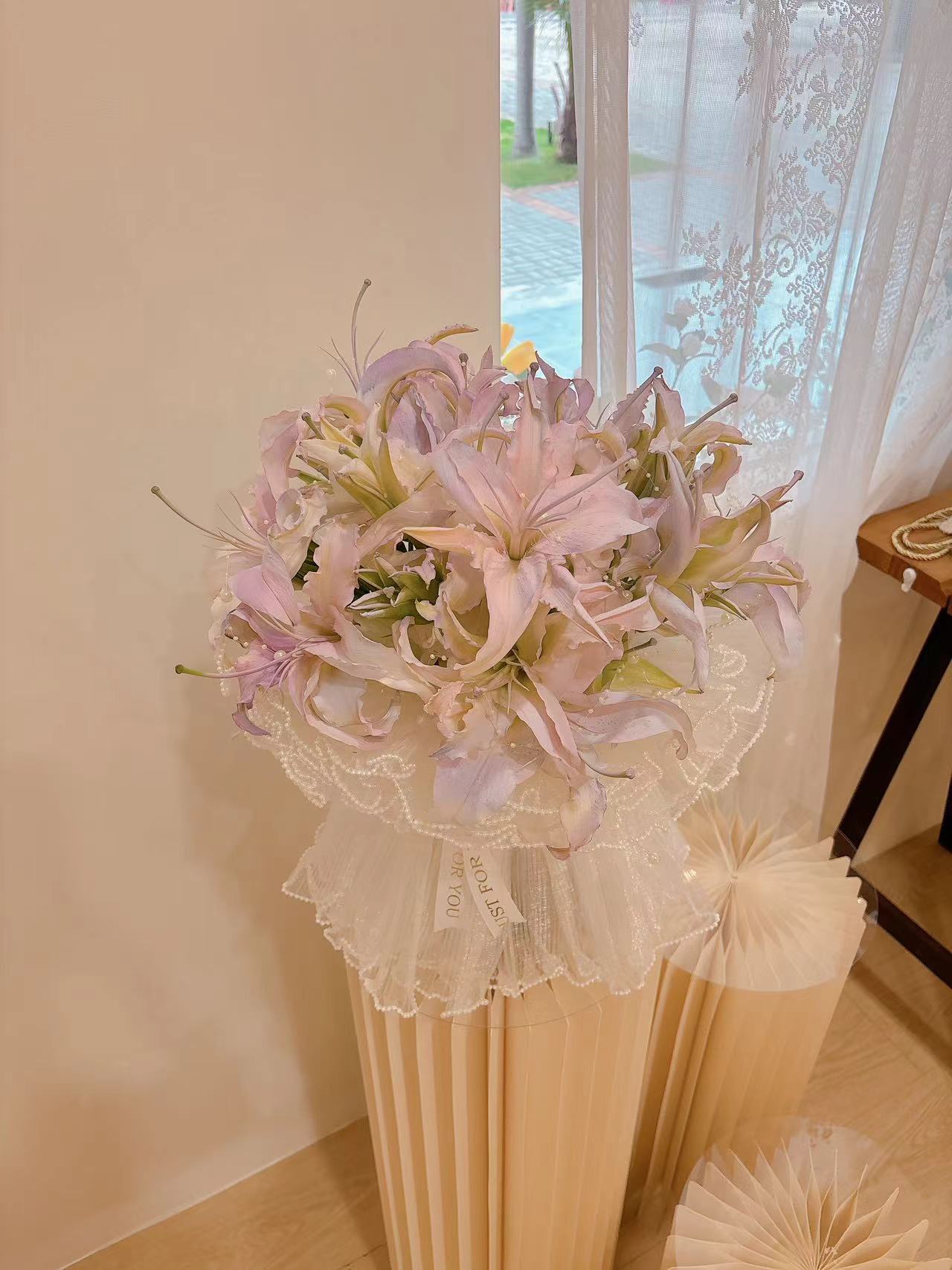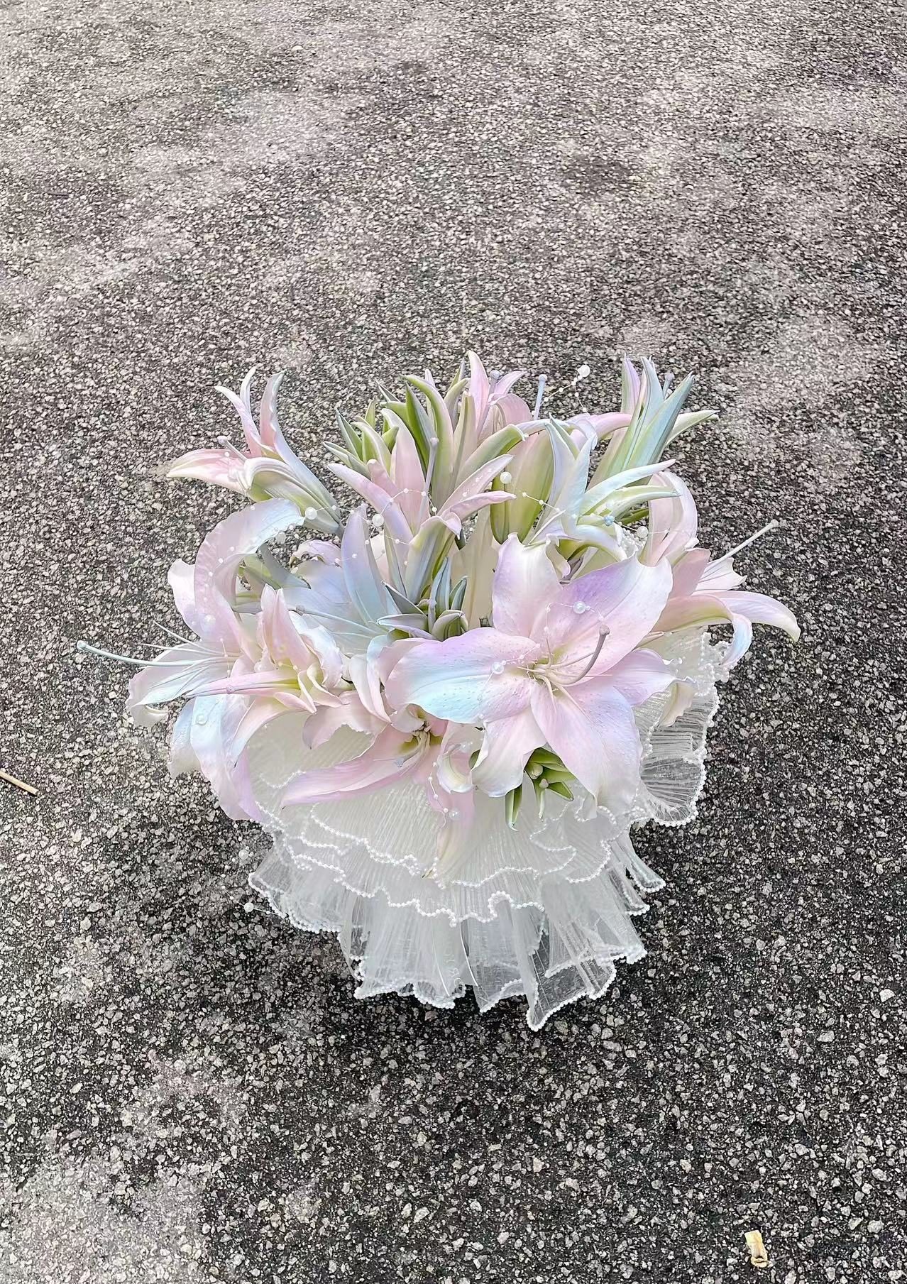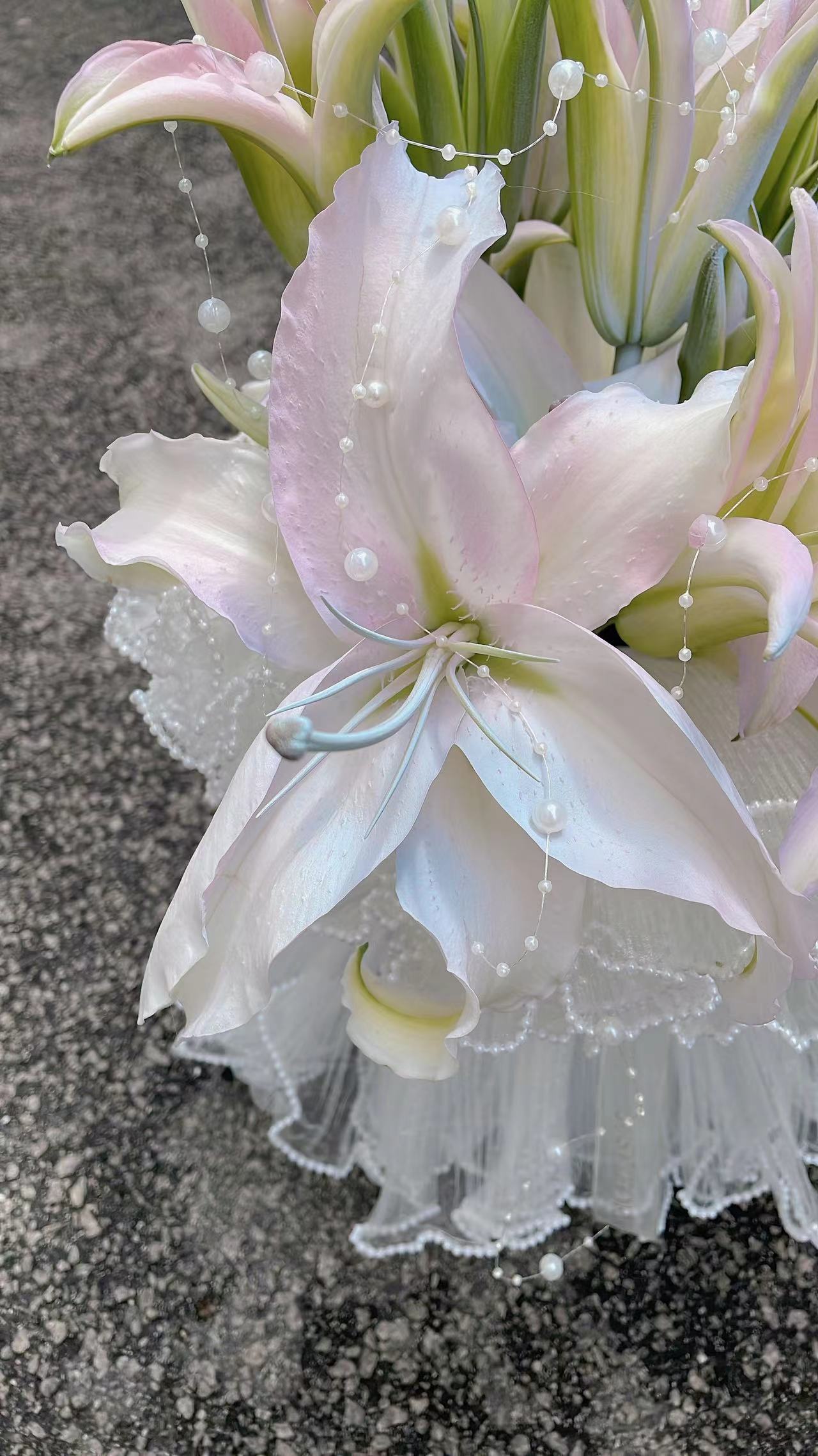 Details: 10 Stalks Fresh Lily + 5*Cloth Mesh + Pearl Chain