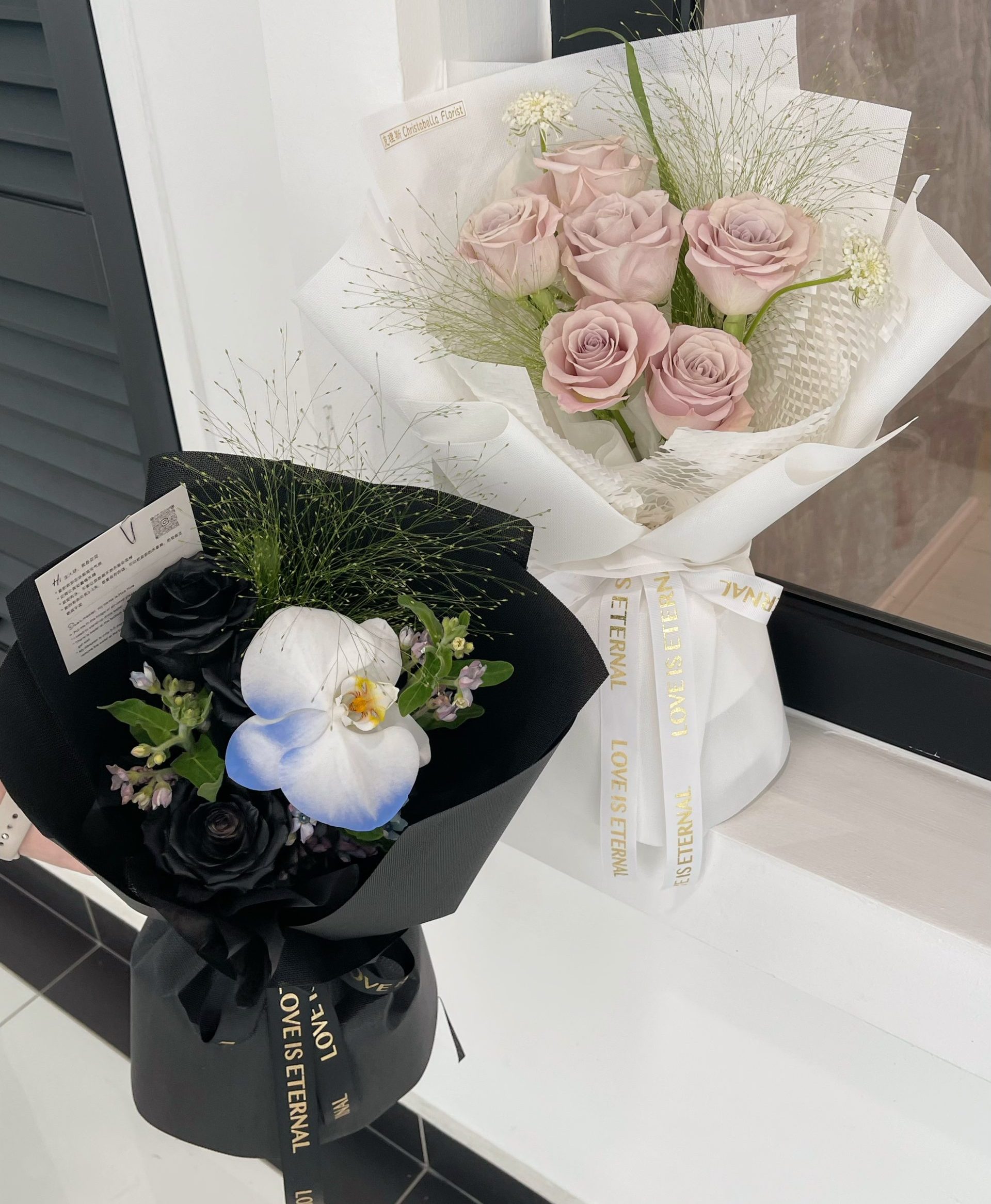 - 3 Stalks Black Roses + 4 Stalks Oxypetalum Caeruleum + 1 Stalks Phalaenopsos + Pancium + Black Wrapping(RM190)
