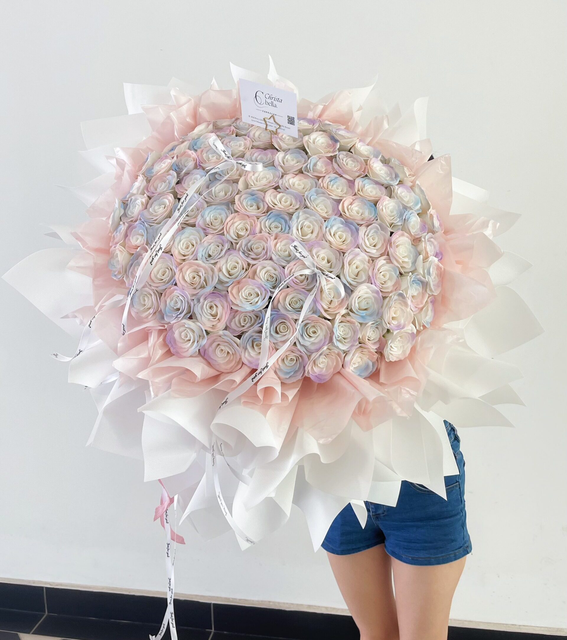 Details: 99 Stalks Ombre Blue+Pink+Purple Soap Roses + White Wrapping