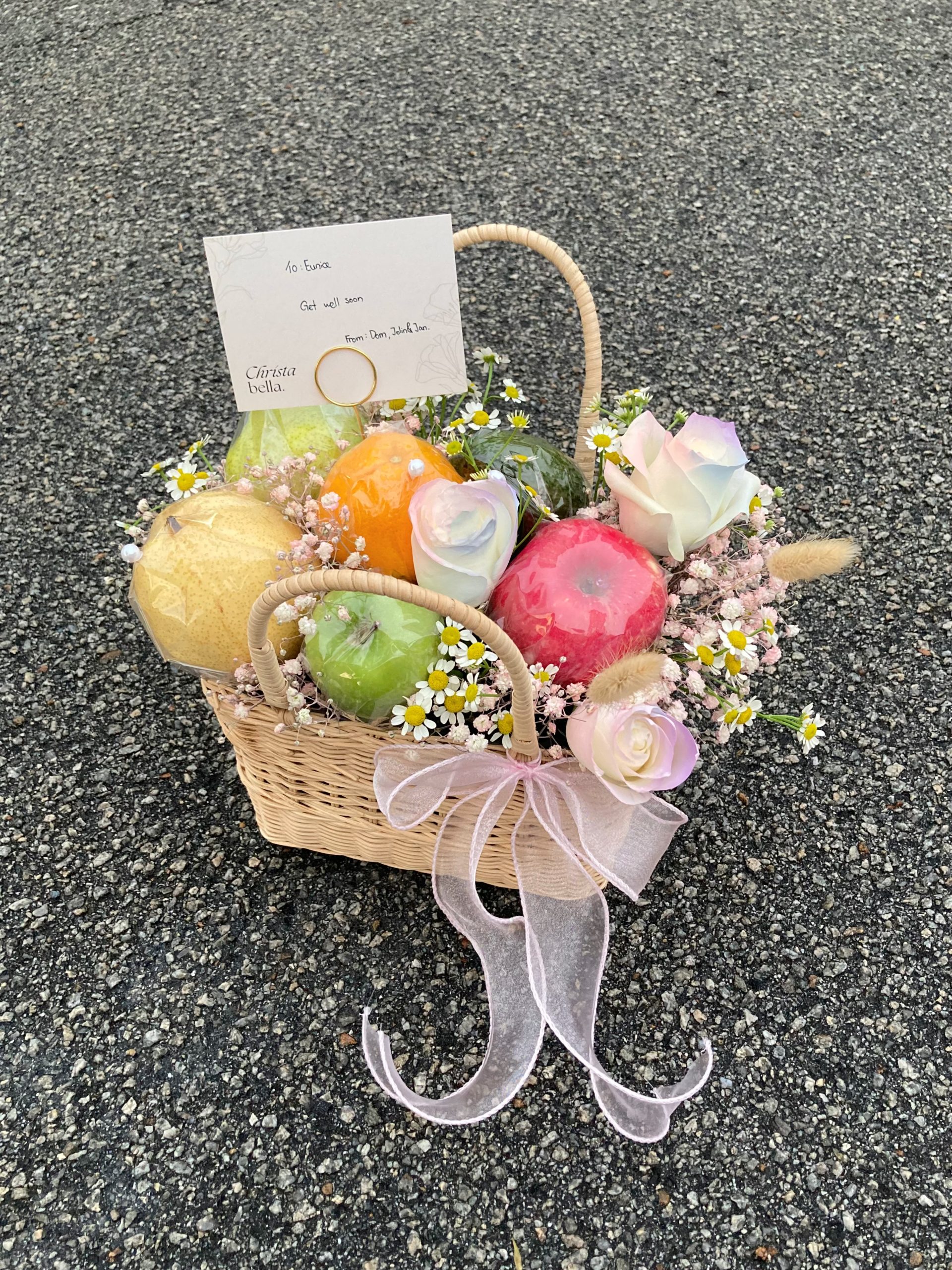 Details: Basket + 3 Stalks Kenya Ombre Roses + 1 Stalks Baby Breath + 2 Stalks Chamomile + 3*Furits