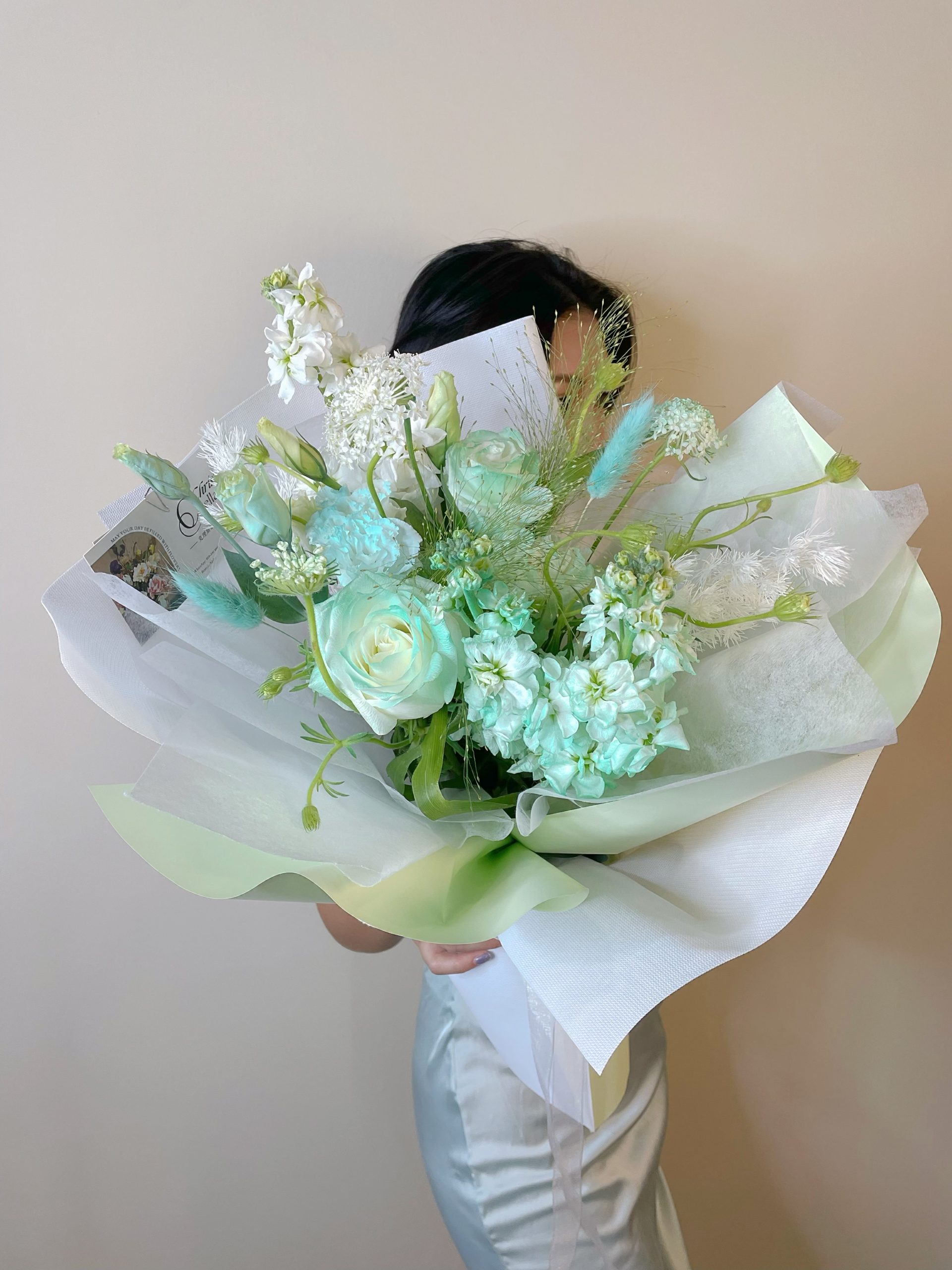 Details: 3 Stalks Matthiola + 1 Stalks Kenya Ombre Mint Green Roses+ 1 Stalks Eustoma +2 Stalks Trachymene + Bunnt Tails + 1*Asparagus + Green & White Wrapping
