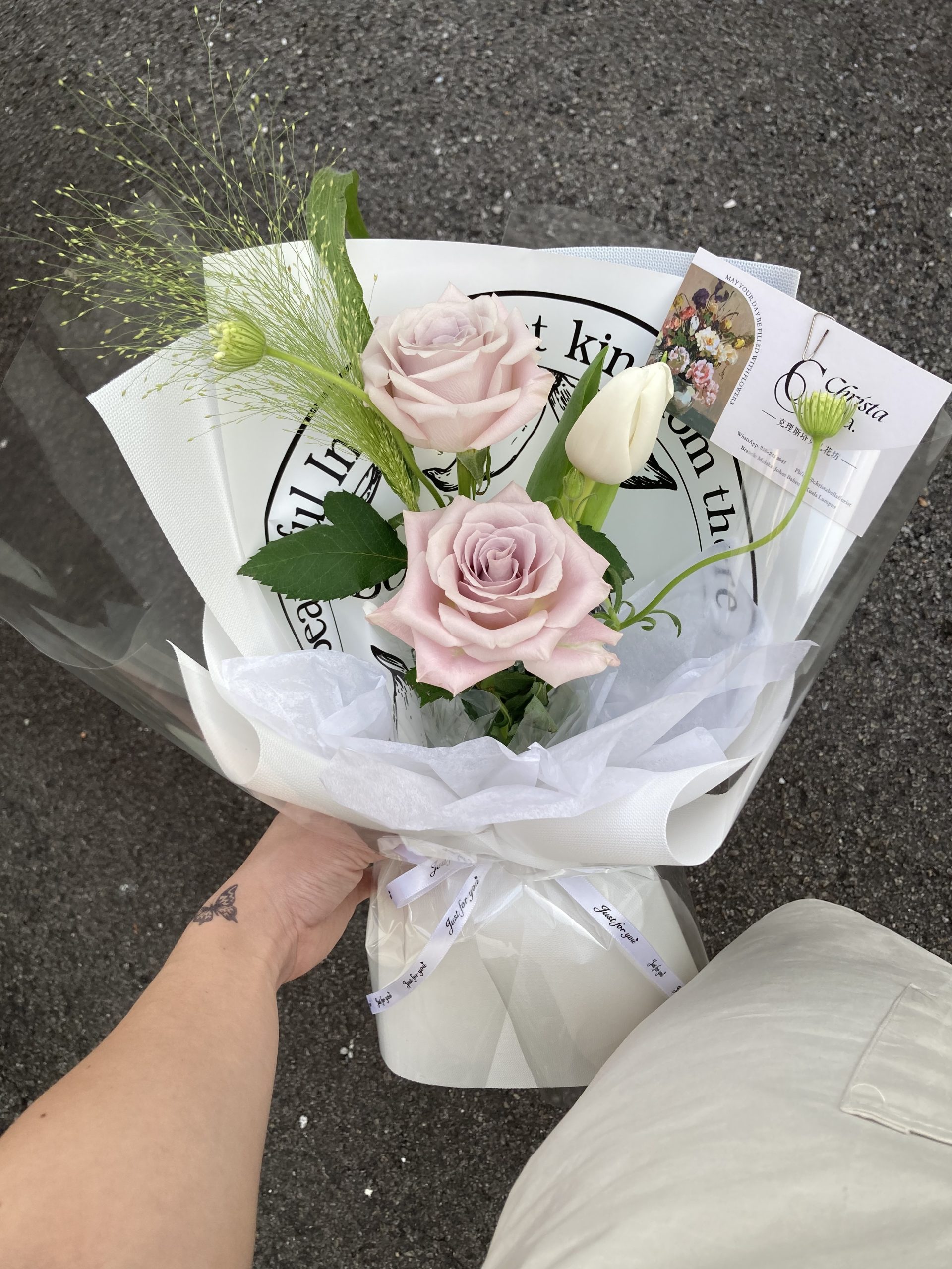 Details: 2 Stalks Fresh Menta Roses + 1 Stalks Tulip + 1 Stalks Trachymene +1 Stalks Panicum + White Wrapping
