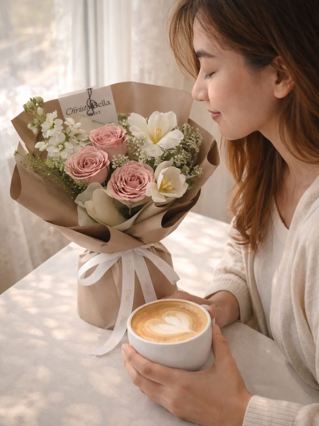 Details: 1 Stalk Matthiola+3 Stalks Cappuccino Roses+2 Stalks Tulip+2 Stalks Ammi+Leaf(Khaki Wrapping)S size-RM190