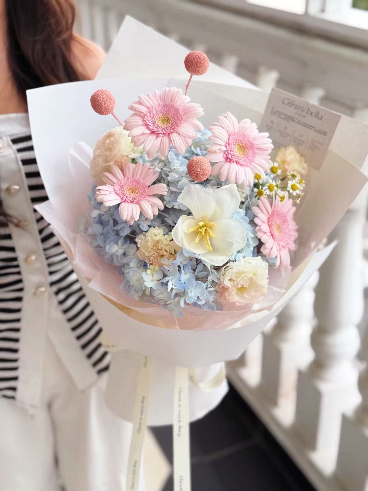 -Hydrangea + 4 Stalks Gerbera + 1 Stalk Chamomile + 1 Stalk Tulip + 2 Stalks Eustoma + 3 Stalks Small Flower (White Wrapping) M Size-RM260