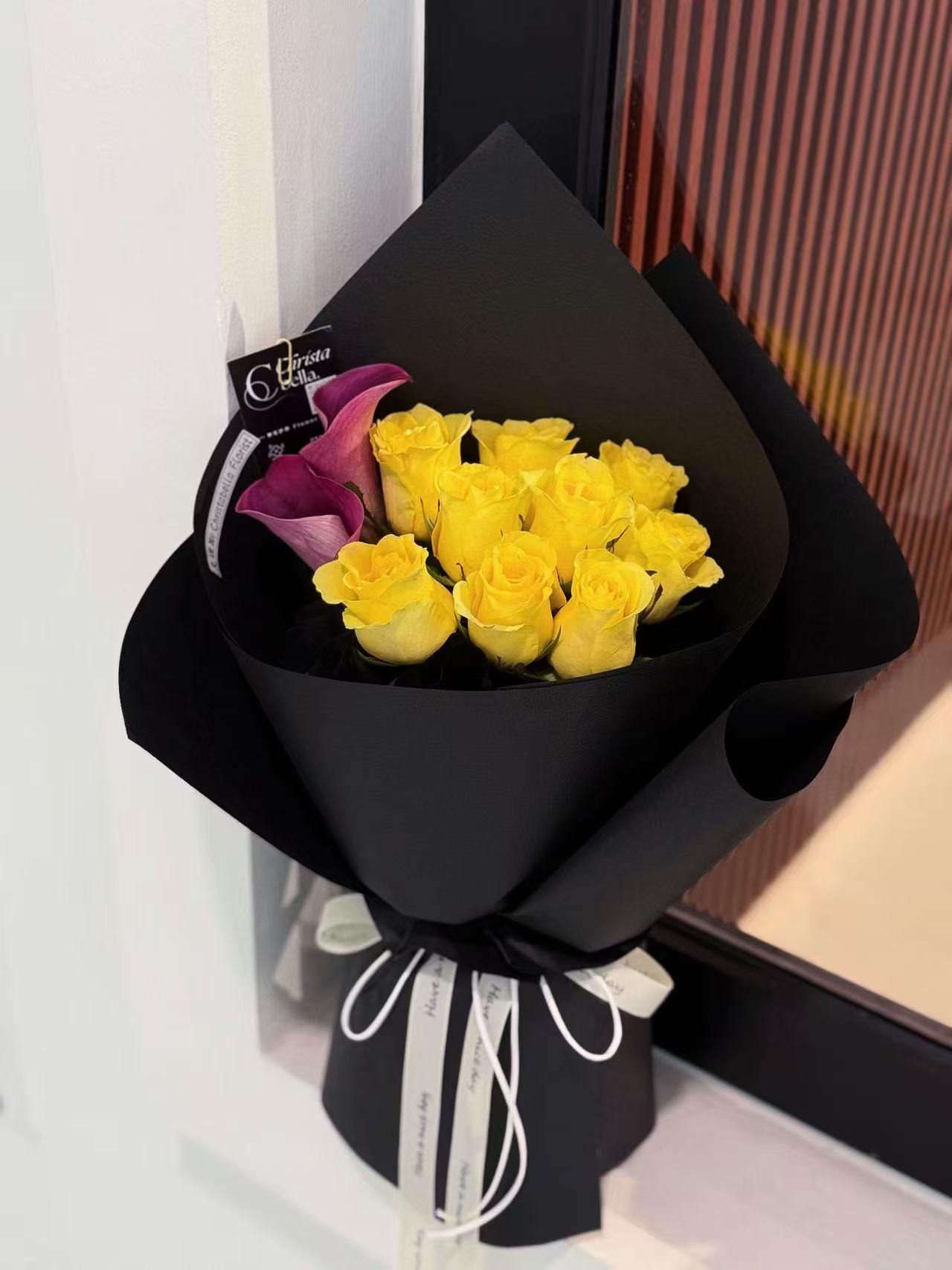 Details: 9 Stalks Yellow Roses + 2 Stalks CalaLily (Black Wrapping)S Size-RM235