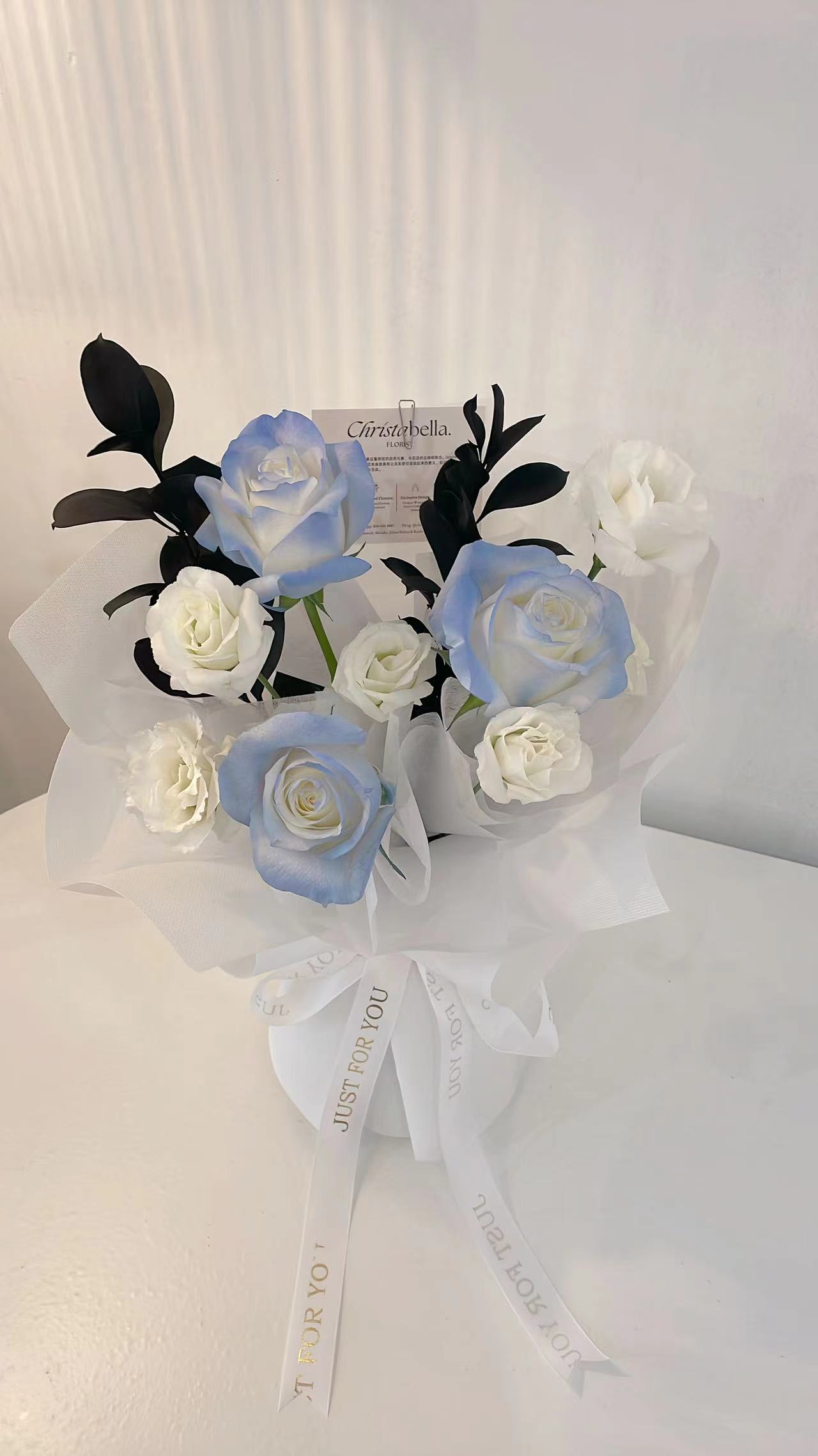 Details: 3 Stalks Fresh Kenya Ombre Blue Roses + 2 Stalks Eustoma +Leaf + White Wrapping