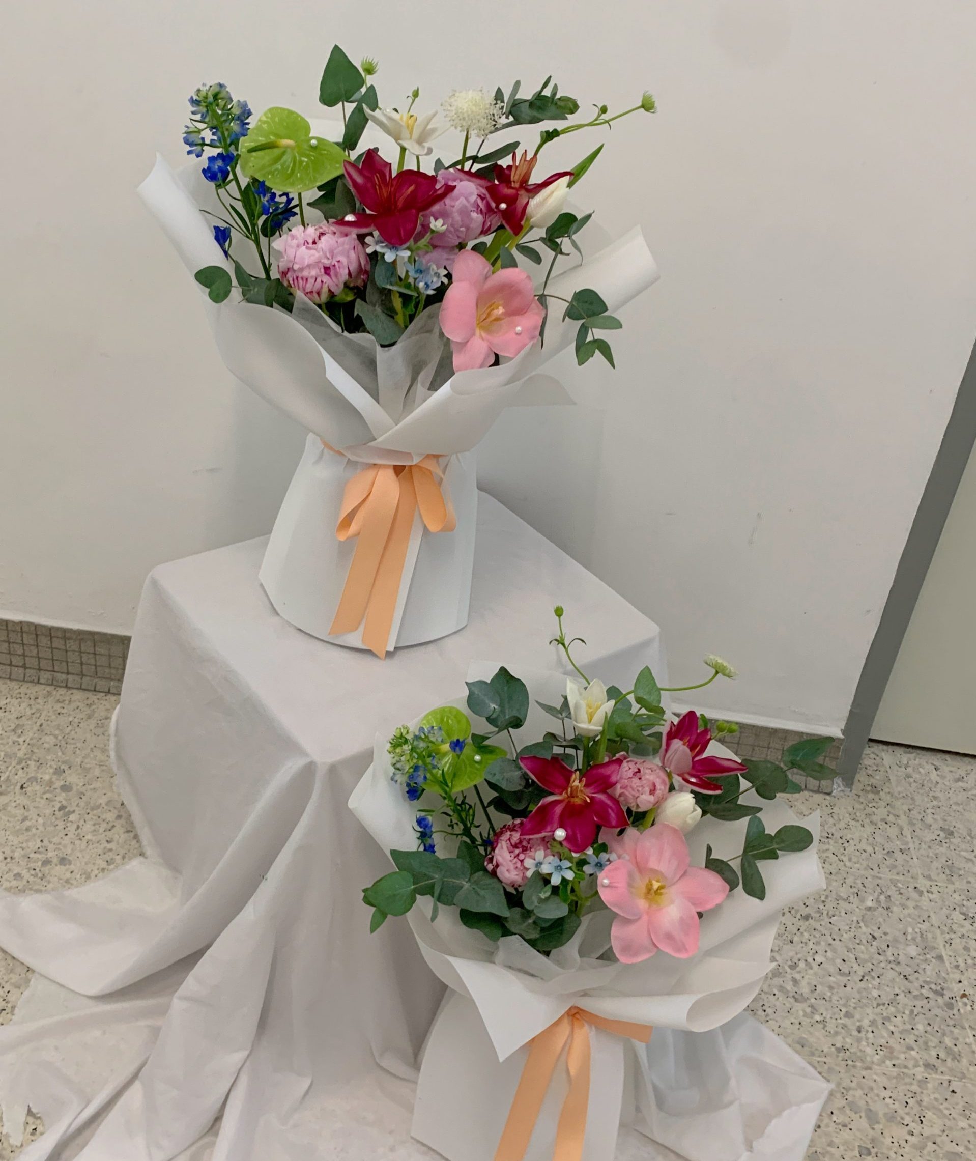 Details: 3 Stalks Pink Peony + 4 Stalks Tulip + 1 Stalks Anthurium + 1 Stalks Mini Delphinium + Leaf + 1 Stalks Oxypetalum Caeruleum + 1 Stalk Trachymene + White Wrapping (RM295)
