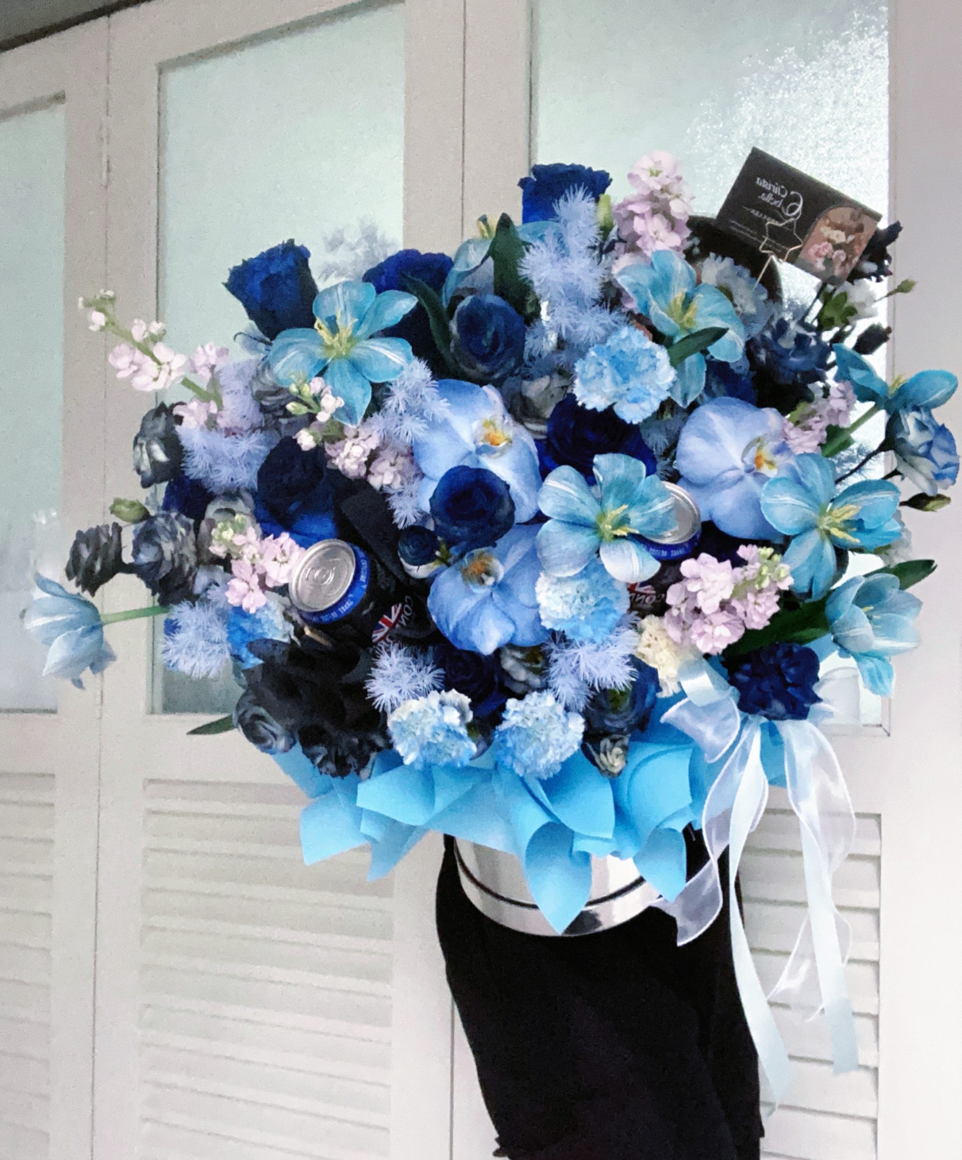 Details: 1 Stalks Phalaenopsis + 10 Stalks Ecuador Roses + 10 Stalks Tulip +20 Stalks Carnation + 10 Stalks Euctoma + 8 Stalks Matthiola + 5*Asparagus + 2 CONNOR”S + Silver Flower Box