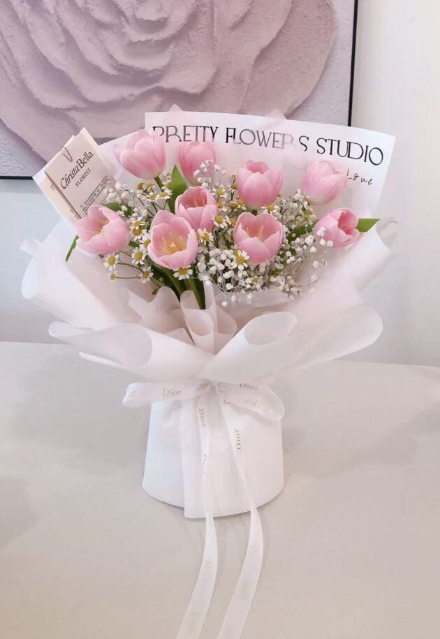 Details: 9 Stalks Pink Tulip + 1 Stalk Baby Breath + 2 Stalks Chamomile (White Wrapping) M size-RM240
