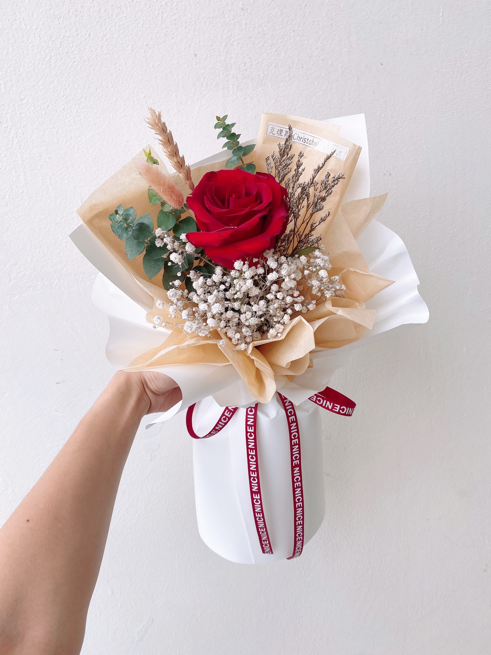 Details: 1 Stalk Fresh Red Roses + Baby Breath + Caspia + Eucalyptus Leave + White Wrapping