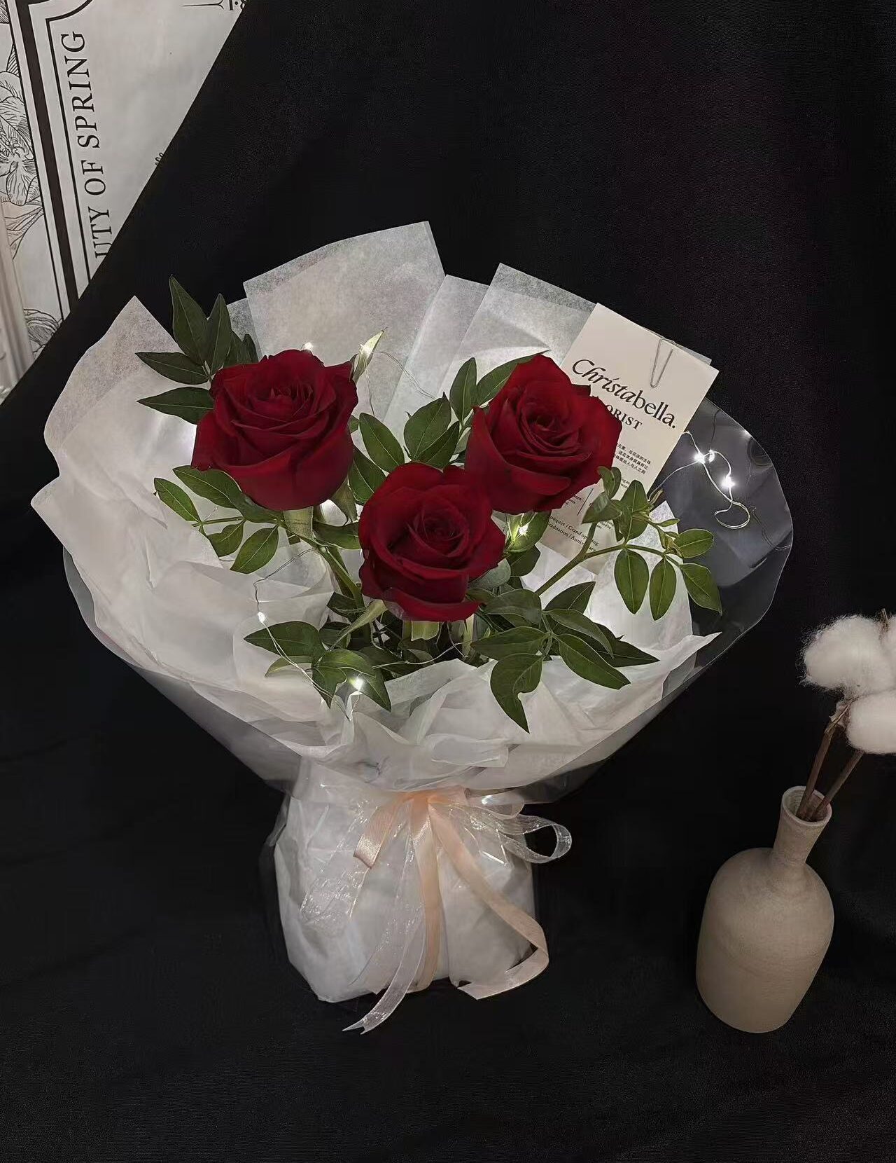 Details: 3 Stalks Red Roses + Leaf + Led + Whote Wrapping