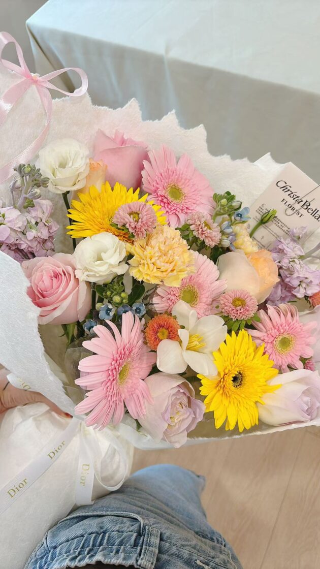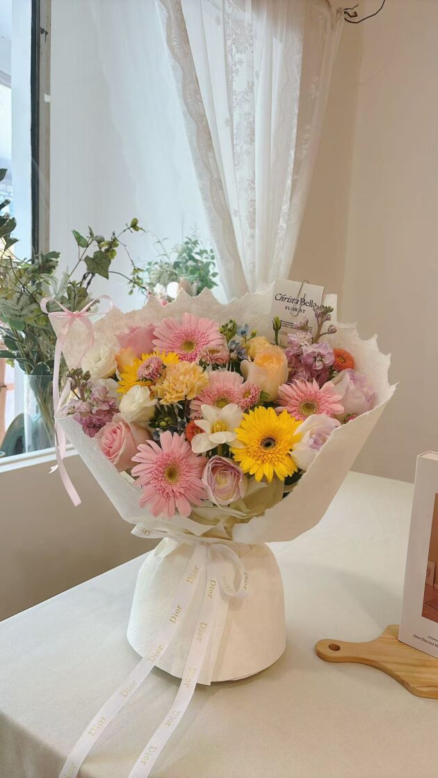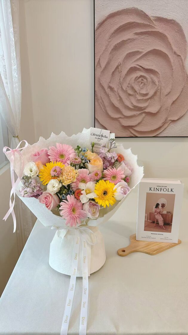 -6 Stalks Gerbera + 2 Stalks Matthiola + 3 Stalks Oxypetalum + 1 Stalk Tulip + 7 Stalks Roses + 1 Stalk Eustoma + 6 Stalks Pompom (White Wrapping) M Size-RM300