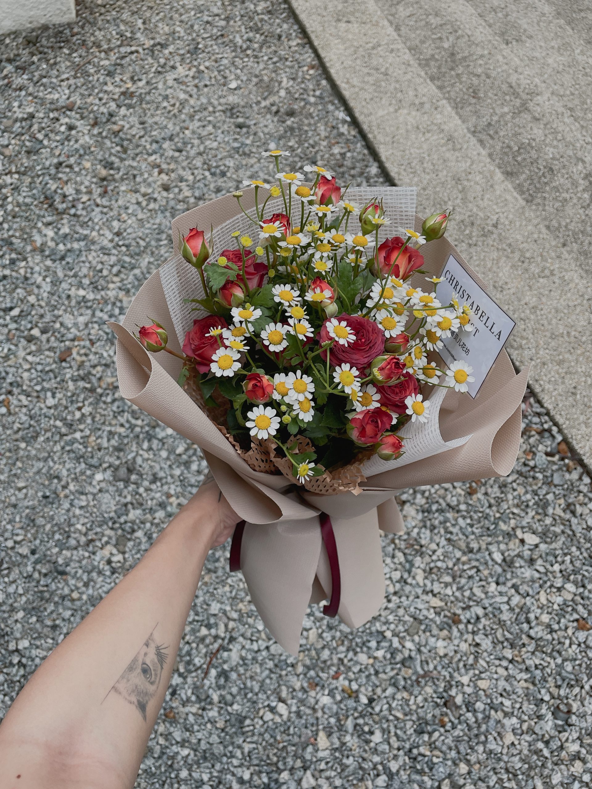 Details: 2 Stalks Fresh Chamomile + 3 Stalks Chocolate Bubbles Roses + Khaki Wrapping
