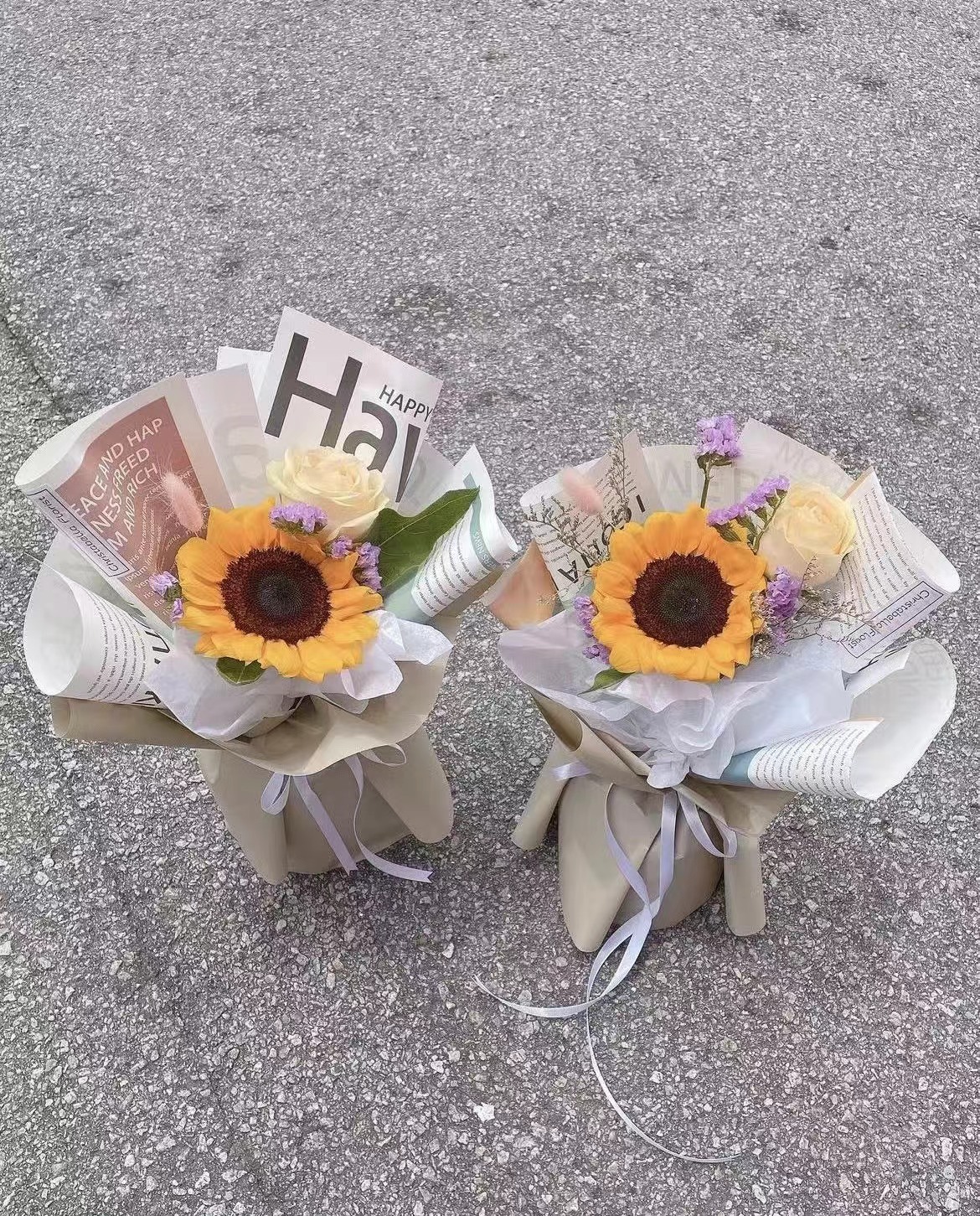 Details: 1 Stalks Sunflower + 1 Stalks Kenya Roses + 3 Stalks Statice + Khaki Wrapping (A-RM145)Size: S SizePreorder: 3-5 Days