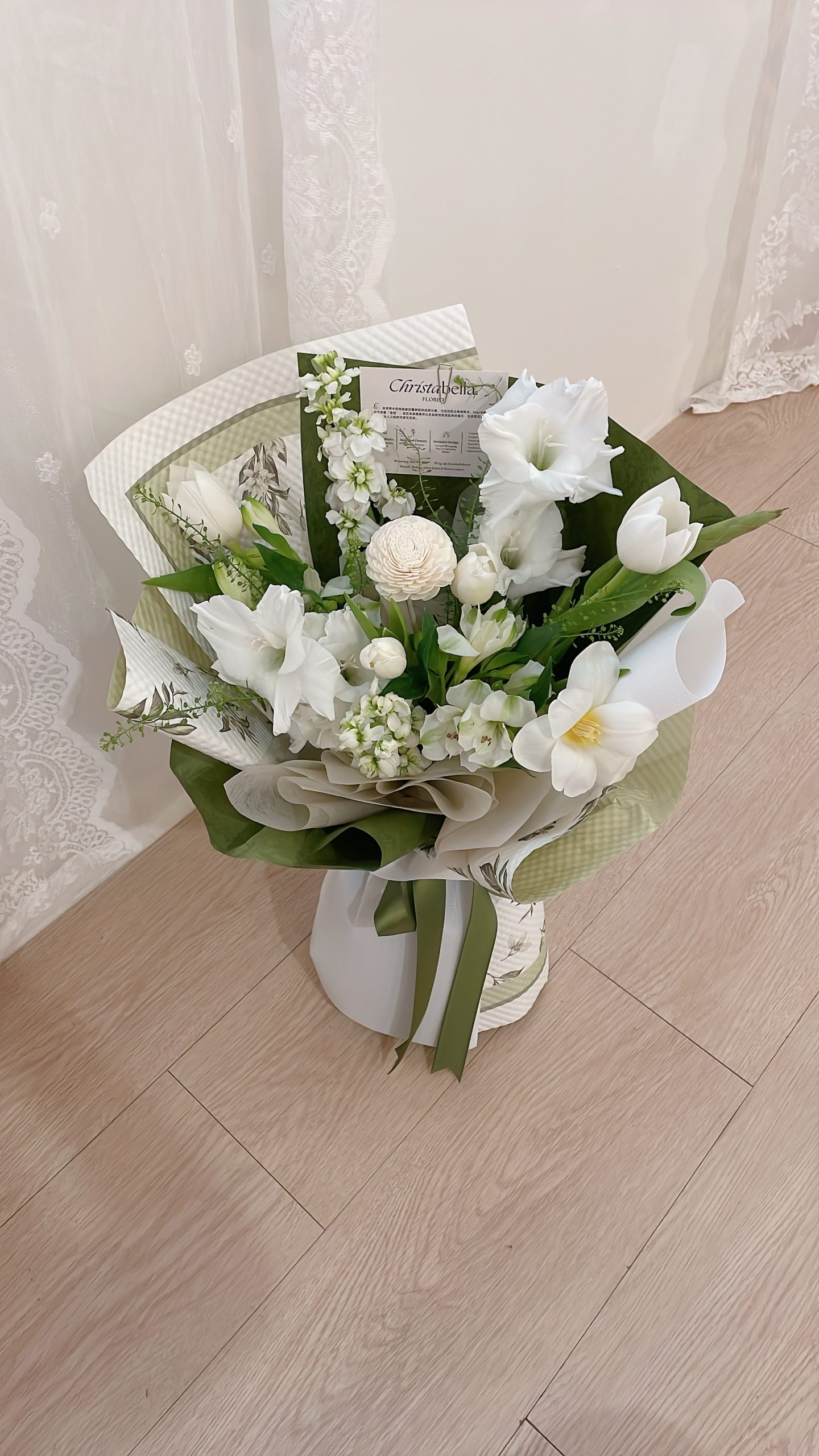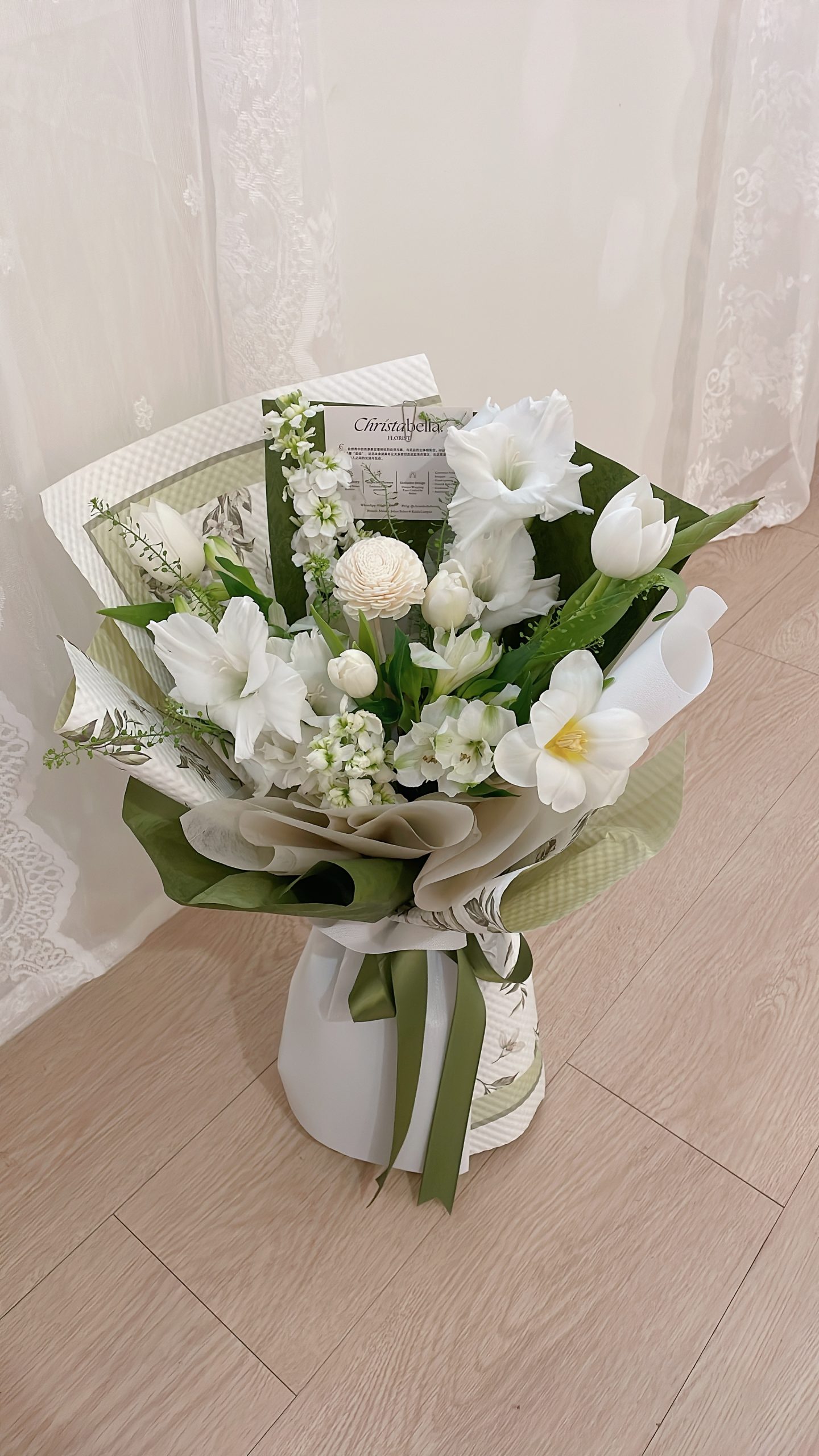 Details: 2 Stalks Gladiolus + 2 Stalks Alstromeria + 2 Stalks Matthiola + 5 Stalks Tulip +1 Stalks Sola Flower + Green & White Wrapping