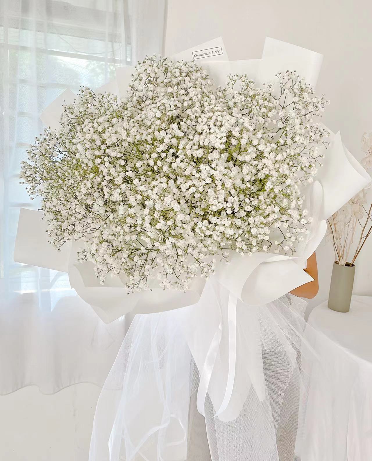 Details: Xl Fresh White Baby Breath + Cloth Mesh + White Wrapping