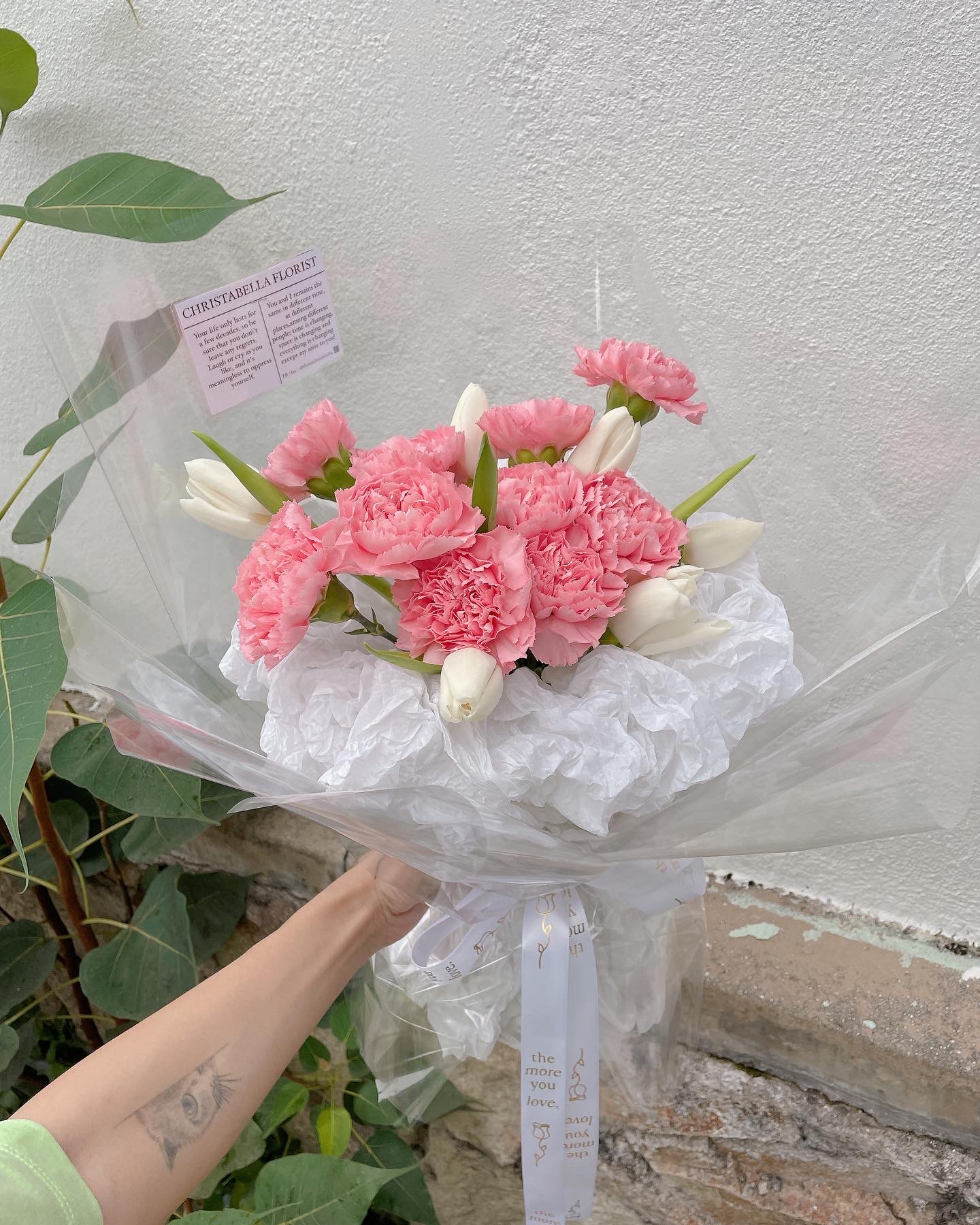 Details: 10 Stalks Fresh Pink Carnation + 9 Stalks Fresh White Tulips + Transparent Wrapping