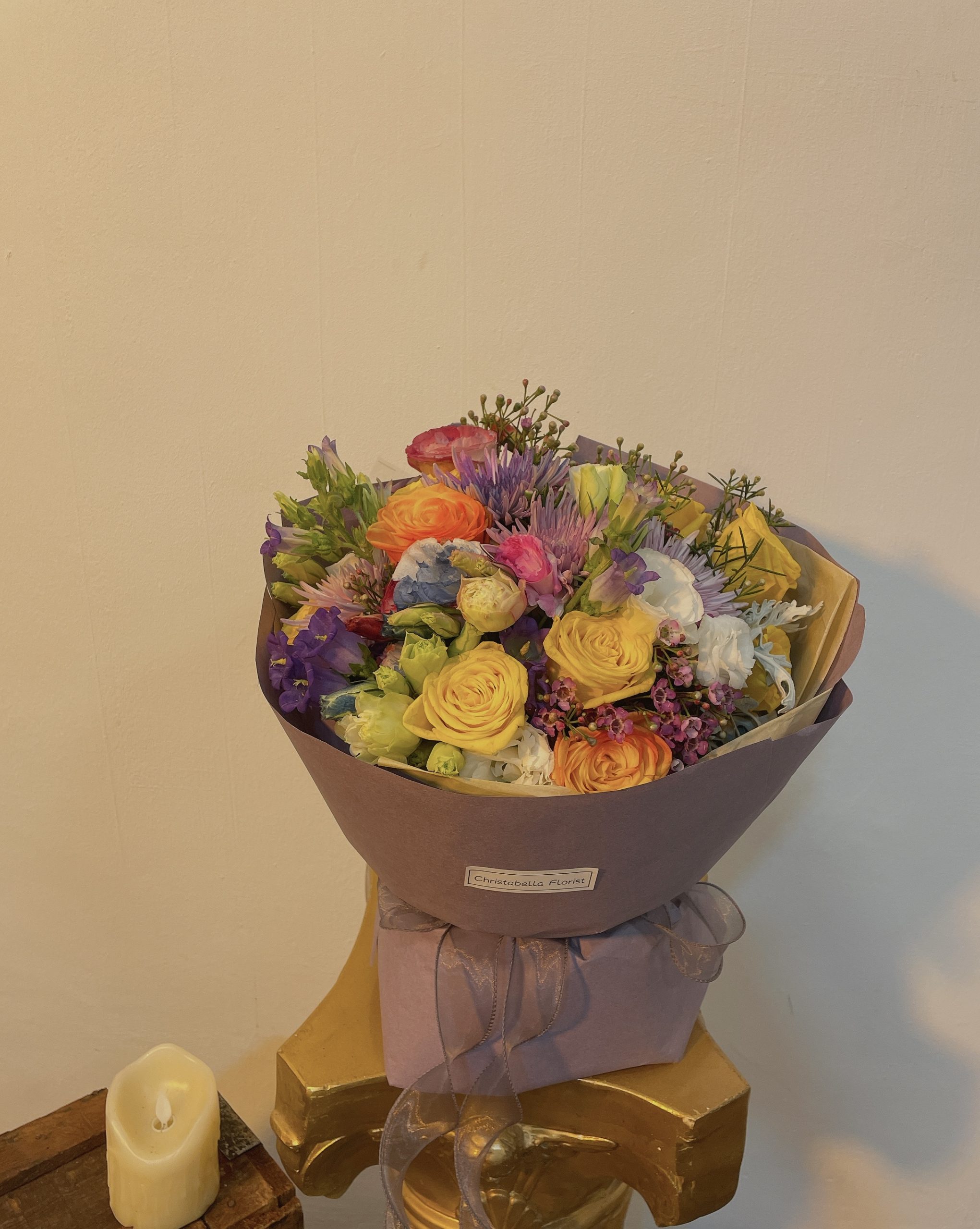 Details: 10 Stalks Fresh Kenya Yellow Roses + 4 Stalks Net Mum + 6 Stalks Eustoma + 1 Stalks Silver Leaf + 2 Stalks Wax Flower + 2 Stalks Campanula + Purple Wrapping
