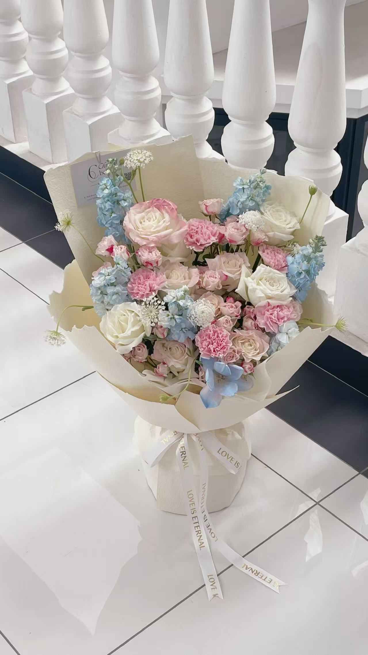 Details:-6 Stalks Fresh Matthiola + 1 Stalks Tulip + 10 Stalks Roses +5 Stalks Sprayrose + 5 StalksCarnation + Trachymene (Cream Wrapping)M Size-RM410Pre-order:1-3 Days