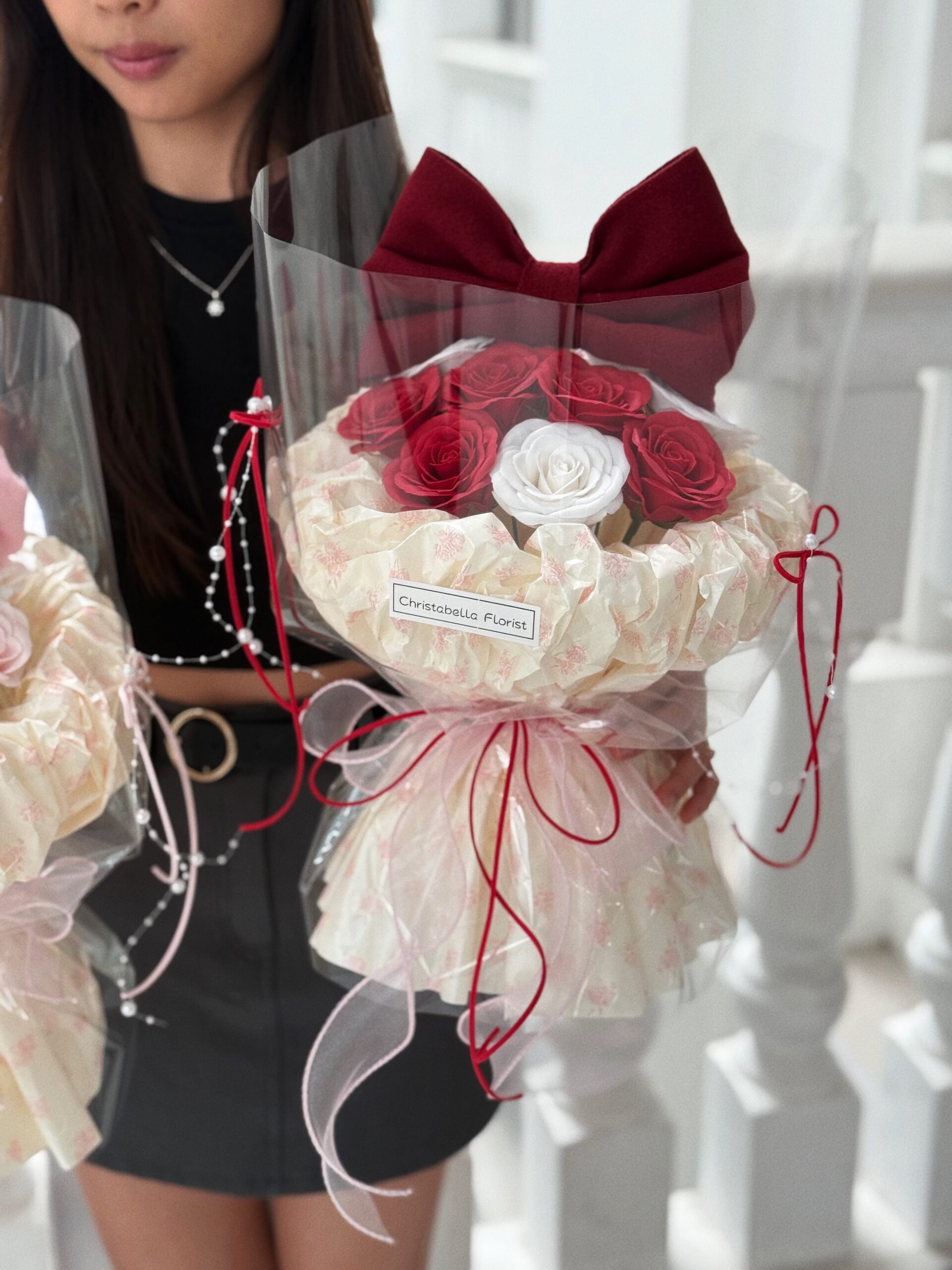 -10 Stalks Soap Red&White Roses + Red Ribbon (Transparent Wrapping)S Size-RM155