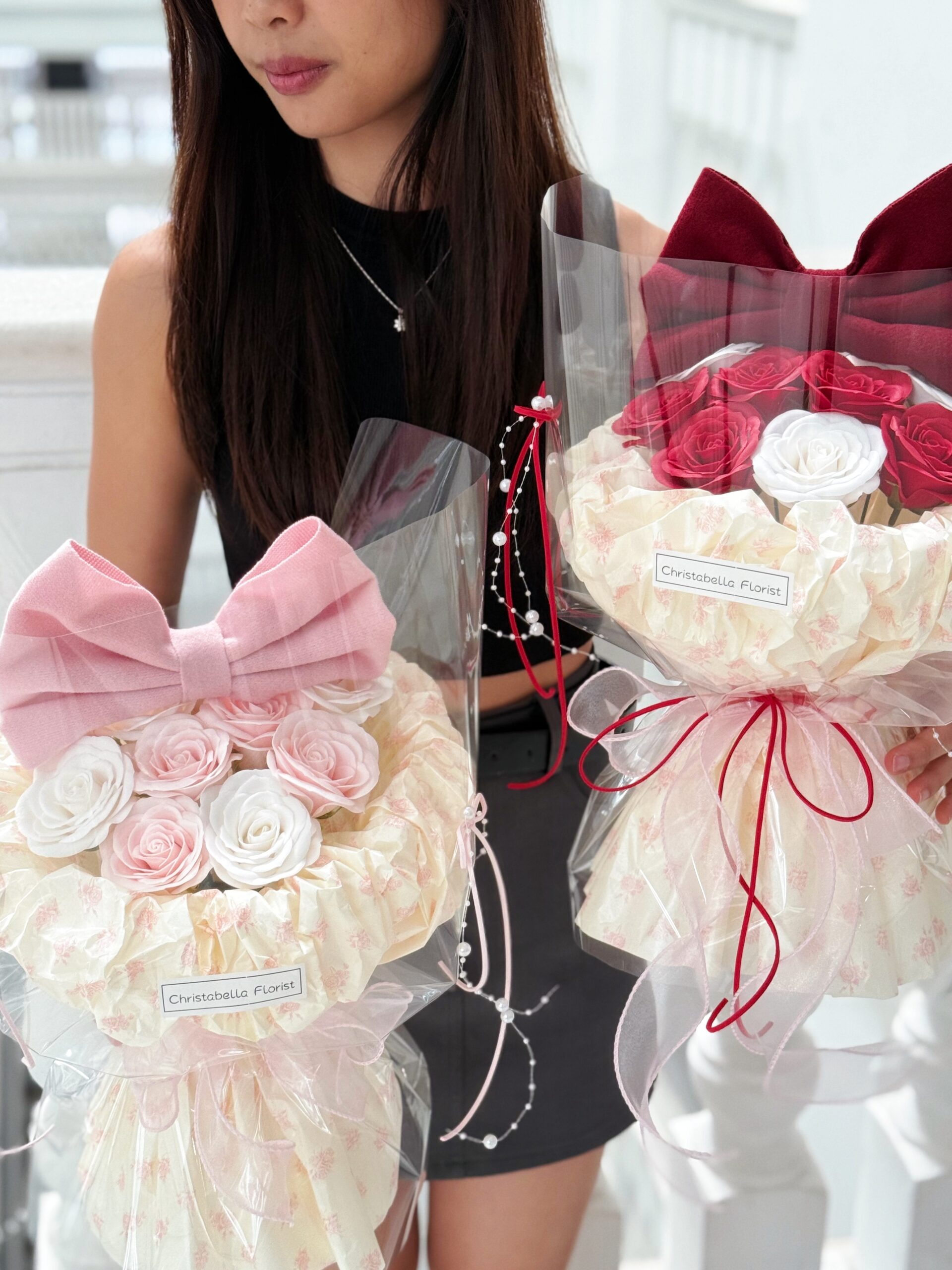 -10 Stalks Soap Pink&White Roses + Pink Ribbon (Transparent Wrapping)S Size-RM155Pre-order:3-5 Days