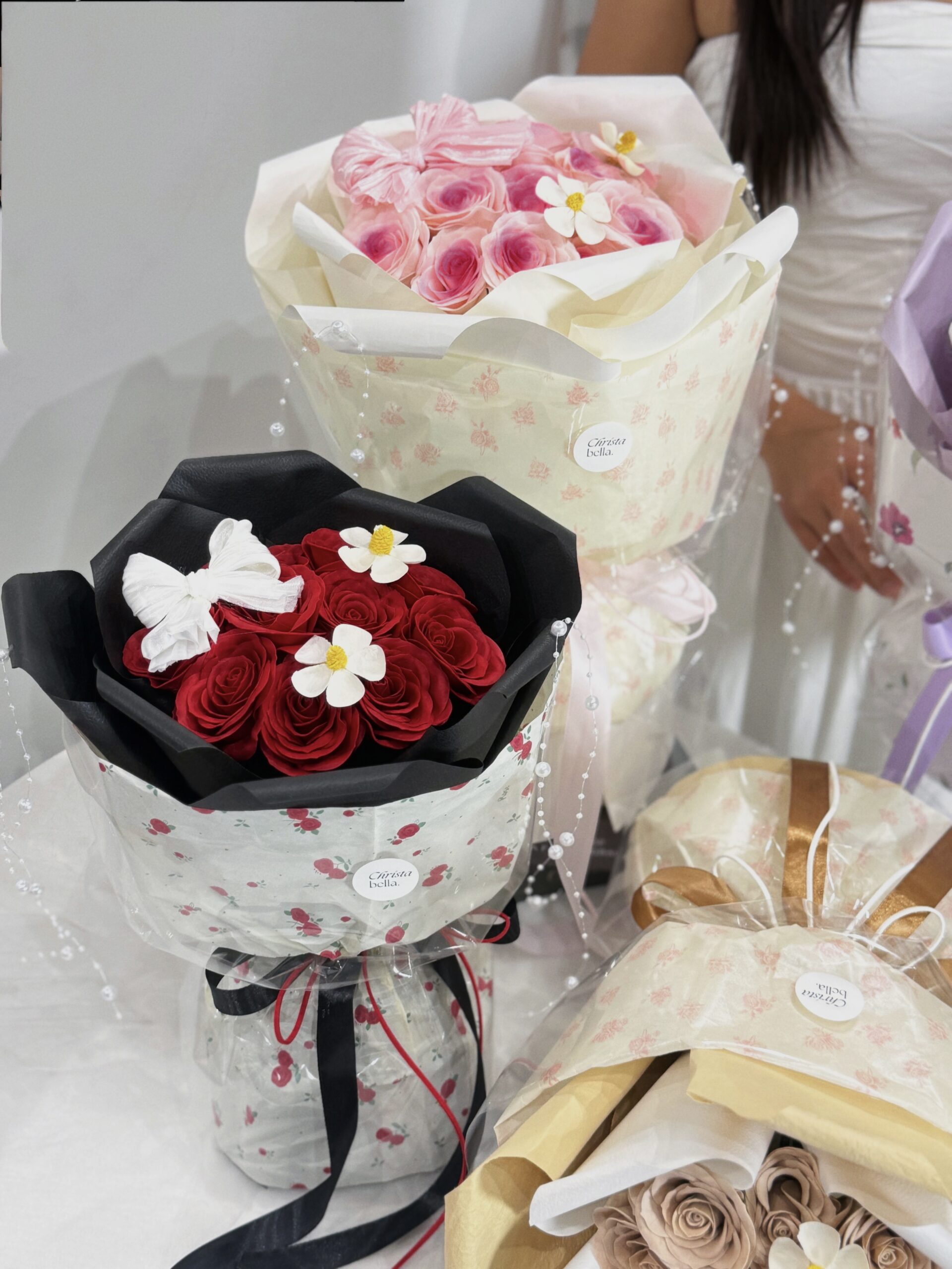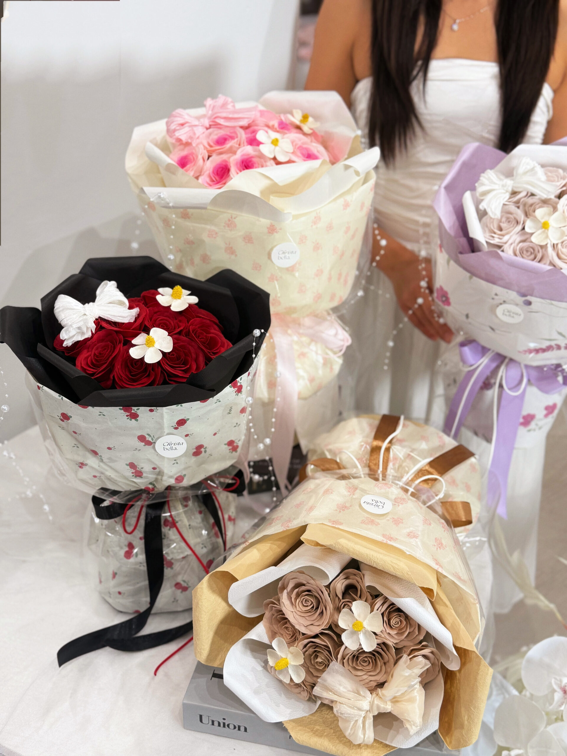 The size and color might vary of every differents bouquets. As all our bouquets and artwork are handmade by our dedicated florists.