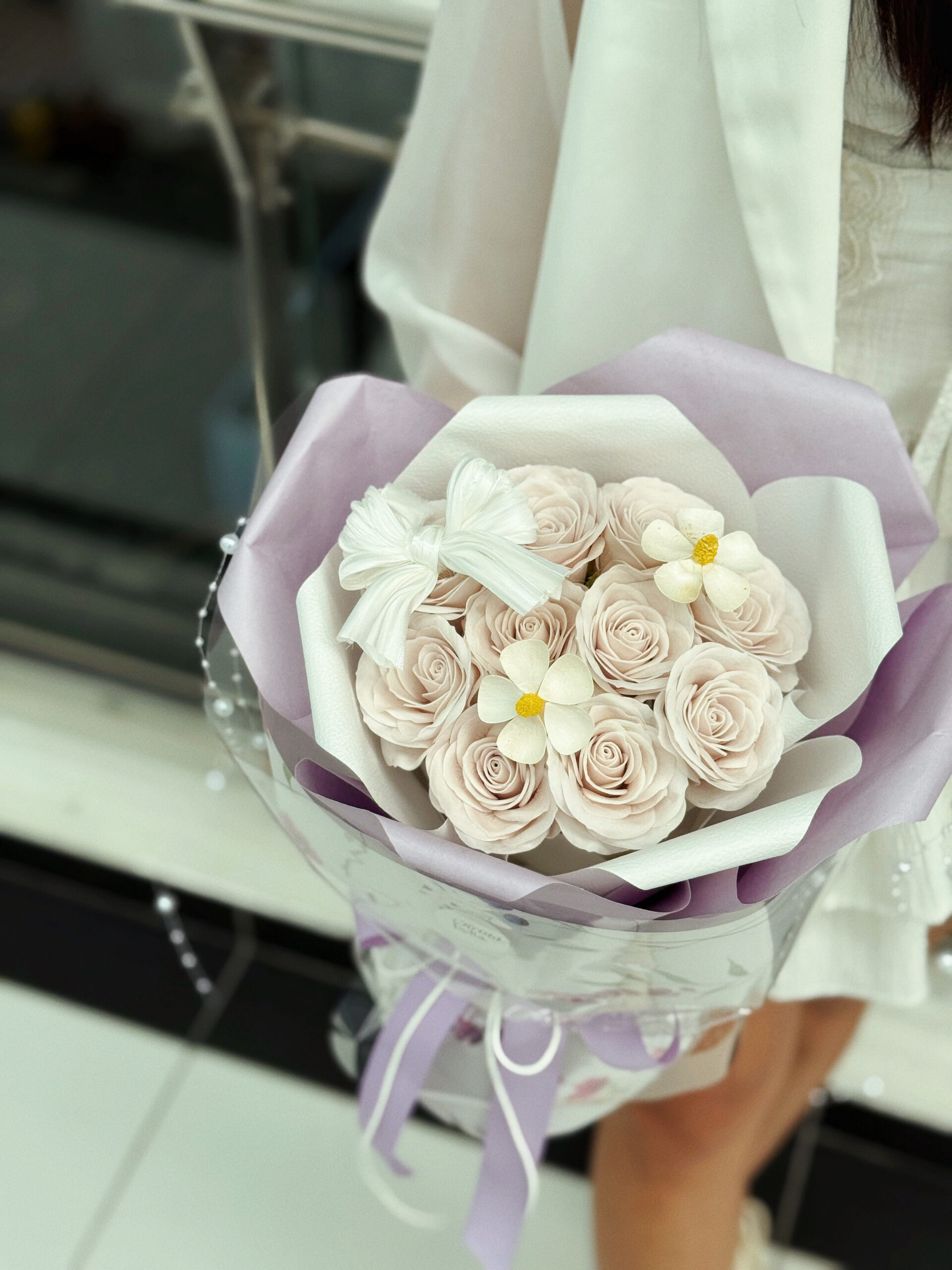 -10 Stalks Soap Menta Roses + 2 Stalks Small Flower + Ribbon (Purple Wrapping)S Size-RM150