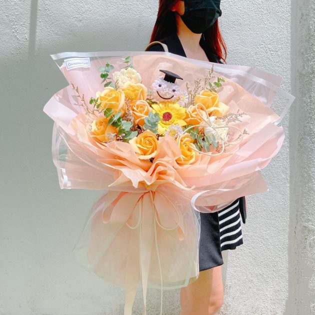 Details: 8 Stalks Orange Roses + 1 Stalks Sunflower + 1 Stalks PingPong + 1 Stalks Artificial Chomamile + 2 Stalks Sola Flower +1 Stalks Craspedia + Caspia + Eucalytus Leave + Pink Wrapping