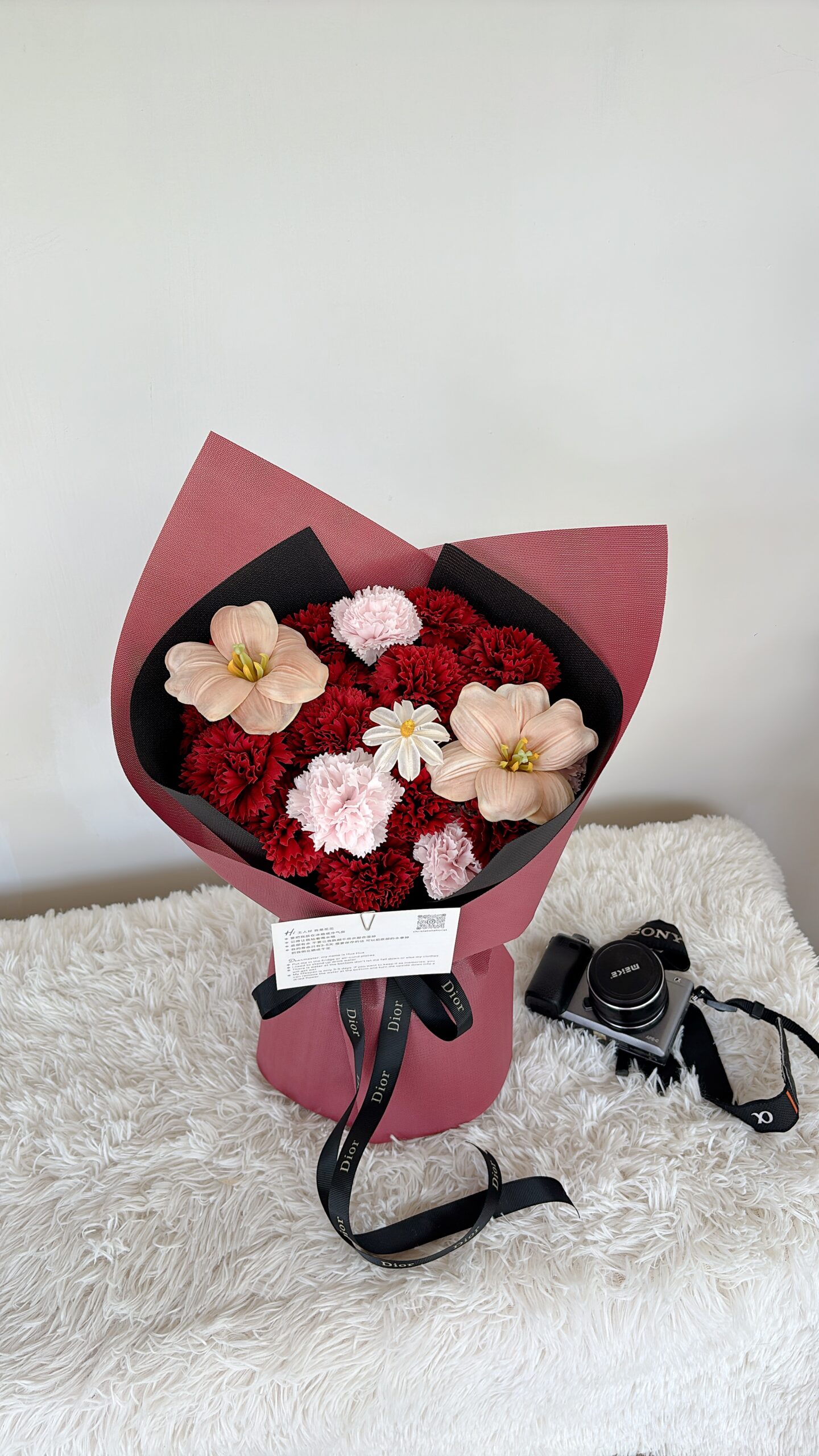 Details: 20stk Soap Roses + 2stk Tulip + red wrapping (M size)